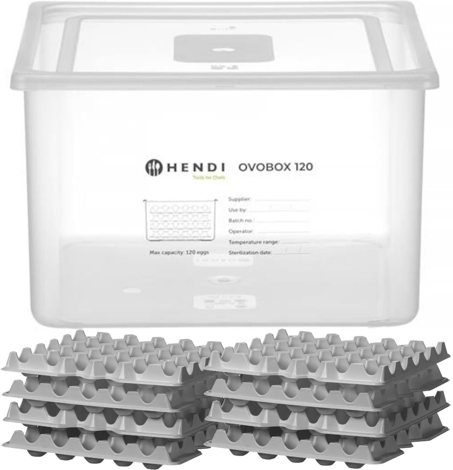 Pojemnik na jajka Ovobox na 120 sztuk, nr kat. 870785 w zestawie 8 tacek, pojemność 18L, GN 2/3 wymiary: 355x325x200 mm, marka Hendi Cechy produktu: Pojemnik na jajka OVOBOX 120 firmy HENDI to praktyczne rozwiązanie pozwalające bezpiecznie przechowywać sterylizowane jajka i chronić je przed skażeniem salmonellą. Jajka przed umieszczeniem w pojemniku i chłodni muszą zostać wysterylizowane. Oferowany zestaw zawiera wytrzymały pojemnik, pokrywę, 8 tacek na jajka z możliwością piętrowania. Idealnie przezroczysty pojemnik wykonany z polipropylenu, o gładkiej, nieporowatej powierzchni - zawartość pojemnika zawsze jest widoczna. Każda tacka mieści 30 jajek (5 × 6 rzędów) - cały pojemnik mieści 120 jajek, ma wymiary GN 2/3, mieszczący 4 wypełnione tacki z jajkami. Tacki wykonane z PET, z możliwością piętrowania oraz z profilowanymi wcięciami po obu stronach ułatwiającymi wyjmowanie tacek z pojemnika. Każda tacka mieści 30 jajek (5 × 6 rzędów) - cały pojemnik mieści 120 jajek. Pojemnik i tacki przystosowane do mycia w zmywarce. UWAGA: Jajka muszą zostać poddane sterylizacji przed umieszczeniem na tackach i w pojemniku, aby zapobiec skażeniu salmonellą. Tacki z jajkami należy układać naprzemiennie w pojemniku, obracając każdą o 90 stopni względem poprzedniej. Odpowiedni do: Kontakt z żywnością Dodatkowe tacki dostępne do zakupienia oddzielnie (kod: 870792). Dane techniczne Marka: Hendi Produkt: Pojemnik na jajka do chłodni Odporność na temperaturę: od -40°C do +80°C. Materiały: PP - polipropylen Rozmiar GN: GN 2/3 (354x325 mm) Długość mm: 355 Szerokość mm: 325 Wysokość mm: 200 Grubość mm: 2,5 Jednostka pojemności: Tace Maksymalna pojemność: 4 Maksymalna objętość pojemnika L: 18