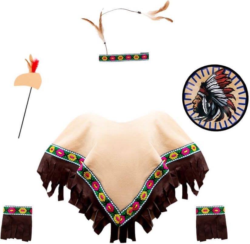 ZESTAW MAŁY INDIANIN PELERYNA TARCZA OPASKA TOMAHA ROZ. UNIWERSALNY Idealny zestaw dla małego Indianina. Chcesz przeżyć niezapomniane chwile w lesie i wiosce Indiańskiej. Twoja wyobraźnia nie zna granic;) Idealny na przyjęcia ,imprezy domowe,przedstawienia szkolne i przedszkolne. Zestaw Mały Indianin pelerynka opaska tarcza tomahawk Pelerynka zapinana na rzep w kolorze beżowym,wykończona wyszywanymi kwiatkami i ciemnobrązowymi rozcięciami o długości ok 7 cm.Materiał polyester. Tarcza z motywem Indianina z pióropuszem. Nakładki na ręce na gumeczce,wykonane z opaski wyszywanej kolorowymi kwiatkami i ciemnobrązowymi rozcięciami o długości ok 7 cm. Opaska z motywem kolorowych kwiatów,zakładana na gumeczkę ok 40 cm. Doczepiony do opaski rzemyk z piórkami o długości ok 50 cm. Tomahawk o długości 36 cm,"ostrze" wykonane z materiału przypominającego filc.Na górze dwa ozdobne piórka.