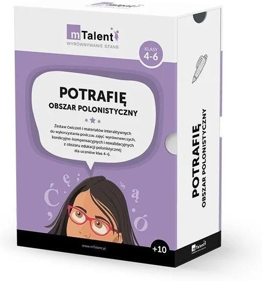 Specjalne potrzeby edukacyjne. mTalent Seria programów mTalent została zaprojektowana w celu wspomagania współczesnego terapeuty i nauczyciela w pracy z dziećmi ze specjalnymi potrzebami edukacyjnymi i rozwojowymi. Programy z serii mTalent to gotowe narzędzia diagnostyczno-terapeutyczne zawierające tysiące interaktywnych ćwiczeń, które z łatwością mogą zostać włączone w program zajęć dydaktyczno-wyrównawczych, rewalidacyjnych, logopedycznych i korekcyjno-kompensacyjnych. mTalent to stale rozwijająca się seria specjalistycznych programów i ćwiczeń wspierających terapię. Od momentu ich powstania baza ćwiczeń każdego programu jest stale powiększana, a co roku seria wzbogacana jest o kolejne pozycje, które odpowiadają na wszystkie potrzeby terapeutów, nauczycieli i ich podopiecznych. Wszystkie programy mTalent dostępne są na zasadzie licencji bezterminowej! Każdy program mTalent dostępny jest w programie dofinansowania Aktywna Tablica 2020-2024! Indywidualizacja i wybór mTalent to najnowsza i najbogatsza na polskim rynku seria programów wspierających terapię. W sumie oferuje ponad 22 tysiące interaktywnych ekranów! Największe doświadczenie na rynku Nad serią mTalent pracuje zespół, który jako pierwszy w Polsce wprowadził technologię do gabinetów logopedycznych i terapeutycznych. Udowodniona skuteczność Wartość merytoryczna programów serii mTalent, ich efektywność, niezawodność i przewagi konkurencyjne zostały potwierdzone w opiniach klinicznych. Najczęściej nagradzana seria mTalent to jedyny polski program wspierający terapię, który otrzymał nagrodę BELMA. mTalent to także jedyne multimedialne rozwiązania nominowane do Bett Awards i konkursu ERA. Status wyrobu medycznego Multimedialne programy mTalent uzyskały status wyrobu medycznego oraz pozytywną ocenę kliniczną, co gwarantuje ich skuteczność oraz bezpieczeństwo Bezterminowa licencja Wydawca serii mTalent udziela bezterminowej i wielostanowiskowej licencji na wszystkie produkty z tej serii. Co więcej, użytkownicy otrzymują także bezpłatne aktualizacje programów i materiały szkoleniowe. POTRAFIĘ. Obszar polonistyczny (klasy 4-6) Zestaw ćwiczeń i materiałów interaktywnych do wykorzystania podczas zajęć wyrównawczych, korekcyjno-kompensacyjnych i rewalidacyjnych z obszaru edukacji polonistycznej dla uczniów klas 4-6 Do wykorzystania na zajęciach terapii pedagogicznej, logopedycznej, na zajęciach wyrównawczych i rewalidacyjnych, a także jako utrwalenie lub uzupełnienie na lekcjach języka polskiego. Blisko 800 ekranów interaktywnych, ponad 50 kart pracy, przewodnik metodyczny oraz zestaw materiałów dodatkowych w jednym pudełku. Dla terapeutów i nauczycieli, którzy chcą uatrakcyjnić prowadzone przez siebie zajęcia w obszarze polonistycznym z uczniami klas 4-6, a w ramach utrwalenia również z uczniami starszymi (np. klasy 7-8). Zawartość programu mTalent. POTRAFIĘ. Obszar polonistyczny (klasy 4-6) Aż cztery publikacje! (w tym 120-stronicowy poradnik metodyczny do programu, autorskie „Wyliczanki Gramatyczne” i instrukcja tworzenia własnych zasobów) Niemal 800 ekranów interaktywnych, ponad 50 kart pracy do wydruku Zestaw tradycyjnych materiałów edukacyjnych uzupełniających multimedialne ćwiczenia Bezpłatne szkolenie zakończone wystawieniem certyfikatu Dostęp do centrum wsparcia technicznego i szkoleniowego mTalent Bezpłatne aktualizacje programu mTalent. POTRAFIĘ. Obszar polonistyczny (klasy 4-6) to: blisko 800 niepowtarzalnych, zróżnicowanych ekranów, które aktywizują uczniów, rozwijają zdolności samokształcenia, pomagają pokonać ewentualne trudności w nauce, zestaw różnorodnych ćwiczeń wspomagający i rozwijający system językowy, a także utrwalający i systematyzujący ogólną wiedzę polonistyczną i doskonalący wiele umiejętności z mnogich obszarów, starannie dobrane, interesujące teksty kultury umożliwiające harmonijny rozwój umiejętności interpretacyjnych ucznia, przyjazny przewodnik metodyczny z podpowiedziami i gotowymi propozycjami zajęć, zestaw materiałów dodatkowych (np. poradnik metodyczny, a także książka „Wyliczanki Gramatyczne” z autorskimi tekstami pozwalającymi zapamiętać np. nazwy i funkcje części mowy i części zdania, a także różnicować je), kurs obsługi narzędzia pozwalającego na tworzenie dodatkowych ekranów multimedialnych dla dzieci (np. większej liczby ekranów indywidualnie dostosowanych do danego ucznia lub zgodnych z jego bieżącymi zainteresowaniami), idealne narzędzie do powtórek materiału z zakresu edukacji polonistycznej dla uczniów klas 7 i 8. mTalent. POTRAFIĘ. Obszar polonistyczny (klasy 4-6) składa się z następujących działów: Części mowy Części zdania Czytanie Rodzaje wypowiedzeń Elementy stylistyki Elementy słowotwórstwa Sylaba, głoska, litera Ćwiczenia wzrokowo-słuchowe Związki frazeologiczne