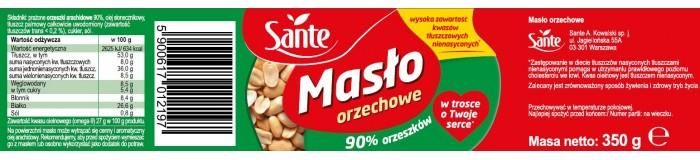 Masło orzechowe sante ma w sobie aż 90% orzechów, jest bogate w wielonienasycone kwasy tłuszczowe, oraz stanowi bogate źródło białka. Może okazać się korzystne w diecie sportowców. Polecamy jako smarowidło na kanapki lub dodatek do potraw.