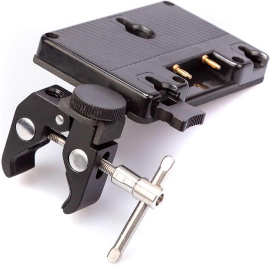 SWIT S-7200A Gold-mount battery plate with clamp for tripod mount and D-tap socket. Płytka kamery z zaciskiem typu Crab firmy SWIT umożliwia zasilanie kamery lub akcesoriów za pomocą akumulatora V-mount o dużej pojemności. Płytka mieści jeden standardowy akumulator Gold mount i posiada jedno nieregulowane wyjście zasilania D-Tap. Zacisk kraba jest przymocowany do jednego końca płytki i pozwala na mocowanie płytki na drążku, stojaku C lub rurze o średnicy od 1 do 1,8 cala. Zacisk mocuje się do powierzchni za pomocą dźwigni w kształcie litery T.