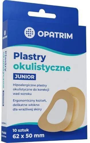 Opis: Opatrim plastry okulistyczne Junior – to wyrób medyczny, który przeznaczony jest do korekcji wad wzroku. . Opis: Opatrim plastry okulistyczne Junior – to wyrób medyczny, który przeznaczony jest do korekcji wad wzroku. . Przeznaczenie produktu: Plaster okulistyczny to produkt przeznaczony do korekcji wad wzroku.. Zawartość opakowania: W opakowaniu znajduje się 10 sztuk plastrów okulistycznych o wymiarach 62 x 50 mm. Charakterystyka produktu: Wyrób Opatrim plaster okulistyczny posiada ergonomiczny kształt, dodatkowo został wykonany z delikatnego włókna, które jest delikatne dla skóry. . Sposób użycia wyrobu medycznego: Przed zastosowaniem produktu należy oczyścić, a następnie osuszyć skórę wokół oka. Opatrunek umieścić na zamknięte oko, nad okiem w taki sposób, aby węższy koniec był umieszczony blisko nosa. . Ostrzeżenia i środki ostrożności: Nie należy przekraczać zalecanej dawki. Jeżeli dolegliwości nie ustępują po 7 dniach należy skonsultować się z lekarzem. Nie należy stosować produktu po upływie terminu ważności zamieszczonego na opakowaniu. Nie zaleca się stosowania preparatu u dzieci. Przechowywać w miejscu niewidocznym i niedostępnym dla dzieci. Nie stosować u osób uczulonych na którykolwiek składnik produktu. Kobiety w ciąży lub karmiące piersią przed zastosowaniem powinny skonsultować się z lekarzem lub farmaceutą. .