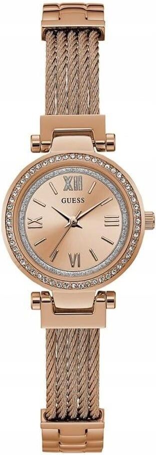 Guess Mini Soho W1009L3 Guess Mini Soho W1009L3 to wyjątkowy zegarek, który łączy w sobie elegancję i funkcjonalność. Jego klasyczny design sprawia, że jest idealnym dodatkiem do każdej stylizacji, podkreślając osobowość i gust właścicielki. Zegarek ten, będący modelem analogowym, wyróżnia się nie tylko estetyką, ale także precyzyjnym mechanizmem kwarcowym, który zapewnia niezawodność i dokładność pomiaru czasu. Mechanizm i jakość wykonania Zastosowany w Guess Mini Soho W1009L3 mechanizm kwarcowy to jedno z najczęściej wybieranych rozwiązań w zegarmistrzostwie. Dzięki drganiom kryształu kwarcu, zegarek charakteryzuje się wysoką dokładnością chodu. Dodatkowo, marka Guess znana jest z wysokiej jakości swoich produktów, co sprawia, że zegarek ten jest nie tylko estetyczny, ale również trwały i niezawodny. Materiały i design Koperta zegarka wykonana jest z stali nierdzewnej, co zapewnia jej odporność na korozję oraz uszkodzenia. Zastosowanie różowego złota w wykończeniu koperty przyciąga wzrok i dodaje elegancji. Okrągły kształt koperty sprawia, że Guess Mini Soho W1009L3 jest uniwersalnym czasomierzem, który doskonale sprawdzi się zarówno w codziennych, jak i bardziej formalnych stylizacjach. Szkło i tarcza W modelu tym zastosowano szkło mineralne, które charakteryzuje się wysoką odpornością na zarysowania oraz doskonałą przejrzystością. Dzięki temu, złota tarcza zegarka zachowuje swój elegancki wygląd przez długi czas, co jest istotne dla osób ceniących estetykę i jakość. Pasek i komfort noszenia Zegarek wyposażony jest w stalową bransoletę w złotym kolorze, co dodaje mu szyku i sprawia, że pasuje do różnorodnych stylizacji. Materiał ten jest nie tylko trwały, ale również elegancki, co czyni Guess Mini Soho W1009L3 doskonałym wyborem na każdą okazję. Dodatkowo, zapięcie bransolety zostało zaprojektowane z myślą o łatwym i szybkim użytkowaniu, co zwiększa komfort noszenia. Kluczowe cechy produktu Poniżej przedstawiamy kluczowe cechy tego modelu, które warto mieć na uwadze: Styl: klasyczny i elegancki, doskonały na różne okazje, Materiał koperty: stal nierdzewna w kolorze różowego złota, zapewniająca trwałość i modny wygląd, Mechanizm: kwarcowy, gwarantujący precyzję i niezawodność, Szkło: mineralne, odporne na zarysowania, Pasek: stalowa bransoleta w złotym kolorze, łącząca komfort noszenia z elegancją, Wodoszczelność: 30m, idealna do codziennych aktywności, Dodatkowe funkcje: datownik oraz wskazówki luminoforowe, Wzór: logo producenta, które dodaje charakteru, Kraj produkcji: Stany Zjednoczone. Guess Mini Soho W1009L3 to propozycja, która łączy w sobie elegancję, funkcjonalność oraz solidne wykonanie, co czyni go doskonałym dodatkiem do każdej damskiej garderoby.