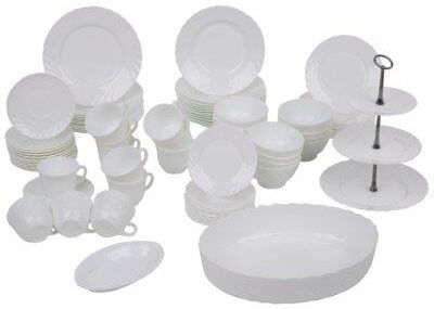 Tradycyjna okrągła forma ozdobiona delikatnie falistym brzegiem to charakterystyczna cecha kolekcji Trianon, jednej z najbardziej popularnych linii znanego i cenionego francuskiego producenta. Subtelna elegancja kompletu obiadowego, ze szkła hartowanego o podwyższonej wytrzymałości na uderzenia i wstrząsy, sprawdza się nie tylko w użytkowaniu domowym, ale równie często wybierają ją restauracje oraz hotele. Klasyczny design świetnie wygląda w każdej aranżacji wnętrz, a duża liczba elementów pozwala na spokojne urządzenie świąt lub większych uroczystości rodzinnych.