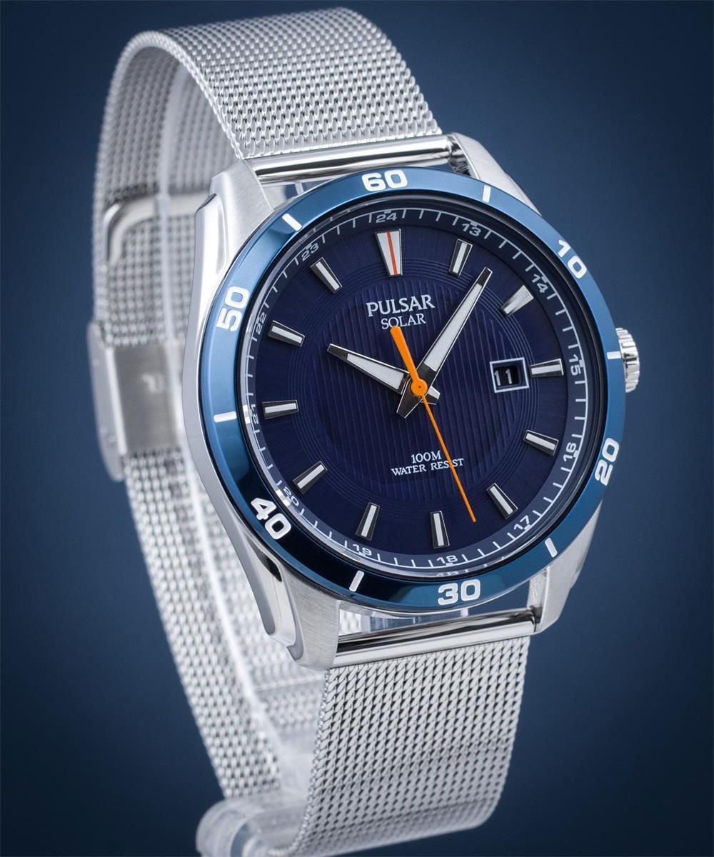 Klasyczny zegarek Pulsar PX3173X1 z ładowaniem energią słoneczną przeznaczony dla mężczyzn. Jest to doskonała propozycja dla osób, które poszukują zegarka do bardziej formalnego stroju. Koperta o średnicy 40 mm została wykonana z wysokiej jakości stali nierdzewnej. Połączono ją z modną, stalową bransoletą typu mesh. Tak dobrane elementy tworzą spójną całość. Tarcza w kolorze niebieskim oznaczona stalowymi indeksami jest bardzo czytelna i przejrzysta. Posiada dokładny mechanizm kwarcowy wyposażony w datownik wskazujący dzień miesiąca. Jest to wersja Solar, która pozyskuje energię do napędzania mechanizmu ze światła słonecznego. Wodoszczelność tego modelu to 50M co pozwala na swobodny kontakt z wodą, np. pływanie.