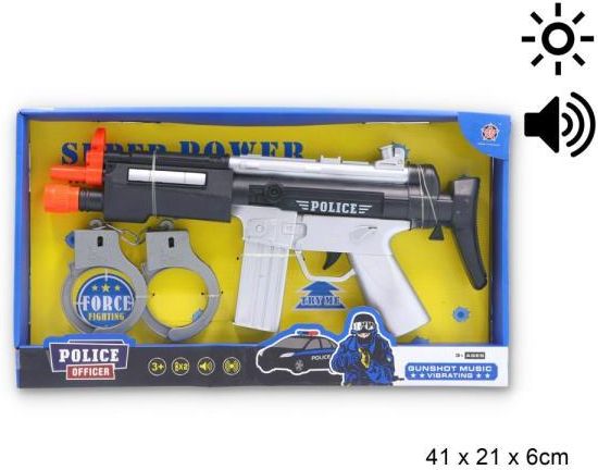 Zestaw policyjny. W zestawie: karabin, kajdanki. Karabin z efektami świetlnymi. Wyrusz na akcje! Baterie: 2 x 1,5V AA (brak w zestawie). Wymiary opakowania: 22 x 39,5 x 4,3 cm Wiek: 3+...