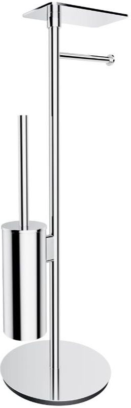 Wykonany z trwałej stali nierdzewnej, wielofunkcyjny stojak toaletowy to praktyczne rozwiązanie, które pozwala optymalnie zagospodarować przestrzeń. Łączy w sobie funkcjonalność szczotki toaletowej, uchwytu na papier i zintegrowanej półki, dzięki czemu wszystkie niezbędne akcesoria znajdują się w jednym, uporządkowanym miejscu. Półka zapewnia wygodne miejsce na środki higieniczne lub drobne przedmioty, podnosząc komfort codziennych rytuałów i eliminując potrzebę montażu dodatkowych elementów wyposażenia. Chrom jest uniwersalnym wykończeniem o srebrzystej barwie i idealnie gładkiej, lśniącej powierzchni. z półką wykonany ze stali nierdzewnej szerokość: 24,9 cm, wysokość: 68,7 cm Instrukcja Rysunek techniczny