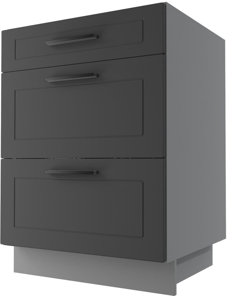 Dzięki produktowi BERGAMO SZAFKA DOLNA D3E/60 HETTICH GRAFIT MAT możesz zwiększyć powierzchnię do przechowywania w swojej kuchni. Szafka wyposażona jest w trzy szuflady z cichym domykiem. System ten zapewnia wygodę i komfort użytkowania. Fronty szuflad wykonane są z foliowanej płyty MDF. Charakteryzuje się ona gładką i nieporowatą powierzchnią, która nie chłonie zabrudzeń. Jest łatwa w utrzymaniu czystości. Folia chroni ją przed wilgocią. Korpus BERGAMO SZAFKI DOLNEJ D3E/60 HETTICH GRAFIT MAT to płyta laminowana. Cechuje ją odporność na zarysowania, uderzenia i ścieranie. Jej powierzchnia nie przyciąga kurzu.