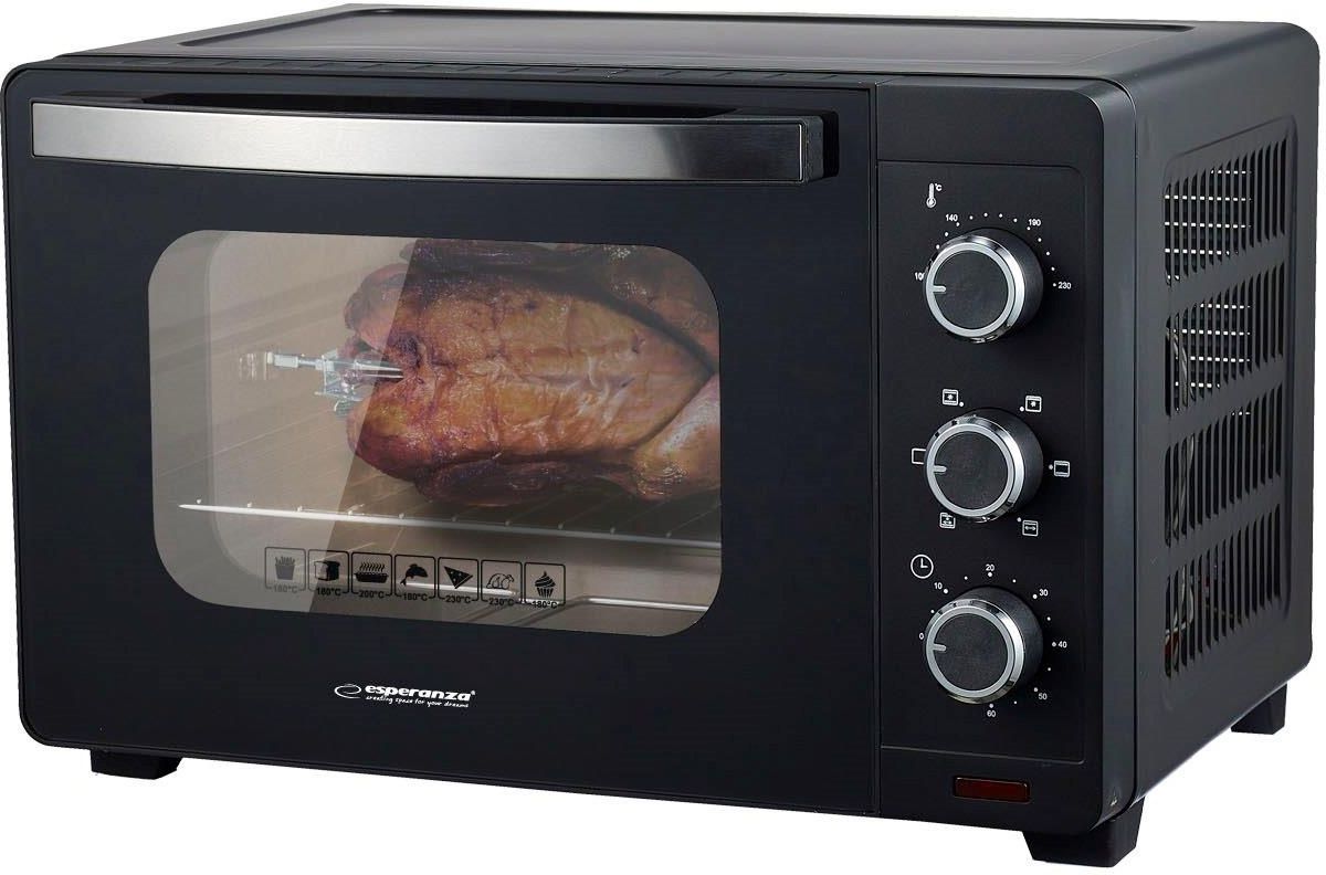 Mini Piekarnik Elektryczny Esperanza Napoli 1600W 25L z Rożnem Przedstawiamy mini piekarnik z konwekcją i rożnem ESPERANZA NAPOLI, który został zaprojektowany z myślą o efektywności i łatwości obsługi. Dzięki swojej kompaktowej budowie o pojemności 25 litrów, idealnie sprawdzi się w niewielkich kuchniach, mieszkańkach oraz dla osób, które cenią sobie wydajną i szybką metodę gotowania. Jest to elektryczny piekarnik, który umożliwia przygotowywanie potraw w tempie, jakiego potrzebujesz. Termoobieg sprawia, że temperaturę pieczenia rozkłada się równomiernie, co gwarantuje najlepsze rezultaty. Wśród kluczowych cech tego piekarnika warto wymienić: Moc: 1600 W Wymiary: Wysokość 260,1 mm, Szerokość 281 mm, Głębokość 334 mm Typ kontroli: Obrotowy Łatwość czyszczenia: Tak Wbudowany wyłącznik: Tak Diody LED: Tak Szybkie nagrzewanie: Tak Zawias drzwiczek: W dół Bezpieczeństwo użytkowania: Urządzenie nagrzewa się podczas pracy, należy zachować ostrożność, aby uniknąć poparzeń. Wszystkie te cechy czynią z mini piekarnika ESPERANZA NAPOLI idealny sprzęt do codziennego gotowania, który łączy w sobie nowoczesny design i funkcjonalność, spełniając oczekiwania nawet najbardziej wymagających użytkowników. Moc: 1600 W Typ piekarnika: Elektryczny Kolor produktu: Czarny Pojemność: 25 L Wymiary: 260,1 x 281 x 334 mm Częstotliwość AC: 50 Hz Zawias drzwiczek: W dół Typ kontroli: Obrotowy Termoobieg: Tak Łatwość czyszczenia: Tak Producent: Esperanza SKU: EKO006N Produkt nowy i oryginalny - Zapewniamy, że oferowany przez nas produkt jest całkowicie nowy i oryginalny. Kompletny zestaw - Produkt dostarczany jest w oryginalnym opakowaniu, z pełnym zestawem akcesoriów, dokładnie tak jak dostarcza go producent. Autentyczność - Nasz produkt pochodzi z oficjalnych kanałów dystrybucji w Unii Europejskiej, co gwarantuje jego autentyczność oraz bezpieczeństwo użytkowania. Wsparcie producenta - Produkt objęty jest oficjalnym wsparciem producenta, zapewniającym pomoc i serwis na wysokim poziomie.