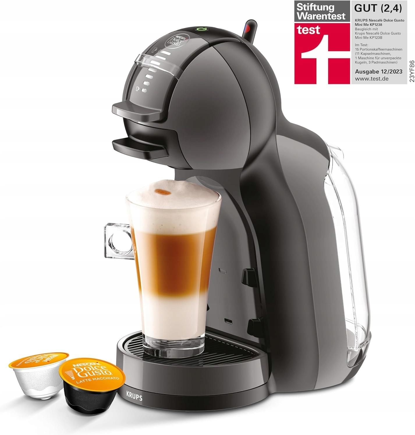Krups Dolce Gusto Mini Me KP123810 Krups Dolce Gusto Mini Me w kolorze czarnym to kompaktowy i stylowy ekspres do kawy na kapsułki zaprojektowany z myślą o wygodzie i jakości. Jego automatyczna obsługa i ciśnienie pompy 15 barów zapewniają napoje o jakości kawiarnianej z łatwością. Niezależnie od tego, czy masz ochotę na bogate espresso, czy kremowe cappuccino, ten ekspres zapewnia idealną filiżankę za każdym razem. Jego niewielkie rozmiary sprawiają, że idealnie nadaje się do każdej kuchni, oferując płynne połączenie formy i funkcji. Wybieraj spośród szerokiej oferty Nescafe Wybierając ekspres kapsułkowy decydujemy się na niego ze względu na szybkość i prostotę przygotowywania kawy. Ale możemy przygotowywać w nim nie tylko kawę. Kapsułki Nescafe to bogata oferta, w której znajdują się kawy czarne, mleczne, herbaty, czekolady i napoje zimne. Zaparz odpowiednią ilość kawy Wielkość ma znaczenie. Dlatego skorzystaj z możliwości regulacji ilości zaparzanej kawy i dostosuj wielkość napoju do własnych upodobań.
