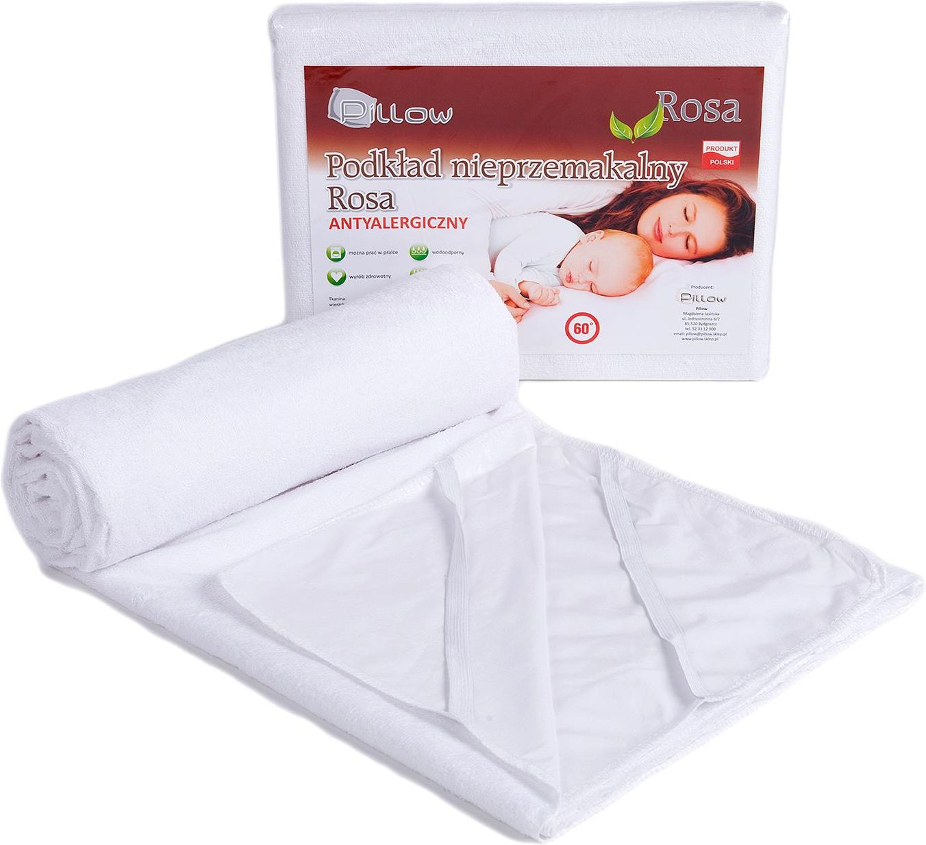 Antyalergiczny nieprzemakalny podkład na materac z linii ROSA Polskiej firmy PILLOW. ROSA jest jest kolejną linią kołder, poduszek i podkładów pod marką Pillow. Po dużym sukcesie kołder i poduszek z linii Benito, firma Pillow wprowadza na rynek internetowy kolejny produkt pod nazwą Rosa, który cieszy się dużą popularnością w sprzedaży bezpośredniej. Rosa czyli róża to coś prostego, codziennego, coś co dajemy bliskim od tak lub od święta. Coś co jest piękne i pożądane. Rosa to kołdry, podkłady i poduszki starannie uszyte, miękkie i ciepłe a ich niska cena nie oznacza jakości "micro". Dzięki naszemu doświadczeniu udało nam się połączyć wysoką jakość z niską ceną. Rosa jest szyta z tkanin i włókien wyselekcjonowanych z najwyższej jakości materiałów. ROSA to kołdry, poduszki i podkłady przeznaczone do codziennego użytku w domach, hotelach, pensjonatach i szpitalach. Produkty wykonane są z najwyższej jakości antyalergicznych materiałów.Wysoką jakość produktów potwierdza jego popularność zarówno w sklepach internetowych jak i tradycyjnej sprzedaży bezpośredniej. Wieloletnia sprzedaż nie przyniosła ani jednej reklamacji na tę linię. Tkanina z której są wykonane podkłady jest zatapiana w polichlorku vinylu (gumowana) przez co jej spodnia część jest jednolita i odporna na wielokrotne prania. Idealnie nadaje się zarówno dla dzieci jak i osób starszych a także do normalnej ochrony materaca. Cechuje je nieprzemakalność i wytrzymałość. Są lekkie i przewiewne, a jednocześnie utrzymują stałą temperaturę ciała zapobiegając nadmiernemu poceniu się. Dzięki podgumowaniu podkład w przeciwieństwie od innych dostępnych na rynku "NIE SZELEŚCI". Parametry produktu Rozmiar: 60x120 Antyalergiczny: TAK Gramatura podkładu: 230g/m2 Tkanina wierzch: frotte Tkanina spód: polichlorek vinylu Pranie: można prać w pralce Temperatura prania: 60 stopni Kolor: biały Mocowanie: gumki na rogach (widoczne na zdjęciach) Opakowanie: worek foliowy Certyfikat: Oeko-tex100 - nie posiada szkodliwych substancji Producent: Pillow Kraj pochodzenia: POLSKA Właściwości wypełnienia podkładu: włókna poliestrowe HCS są termicznie skręcane dlatego też charakteryzują się wysoką sprężystością. Zapewniają doskonałą izolację cieplną a także puszystość. Sprawiają, że ludzkie ciało podczas snu swobodnie oddycha. Przeciwdziałają osadzaniu się roztoczy i kurzu a dzięki swoim właściwościom zapobiegającym namnażaniu się bakterii i grzybów jest zalecana w rehabilitacji leczniczej osób dotkniętych nadmierną reakcją organizmu na substancje wywołujące objawy alergii kontaktowej i wziewnej. Produkty antyalergiczne stosuje się w: atopowe zapalenie skóry alergiczny nieżyt nosa alergiczne zapalenie spojówek alergiczne zapalenie gardła i migdałków podniebnych alergiczne zapalenie krtani astma oskrzelowa alergiczne zapalenie zatok