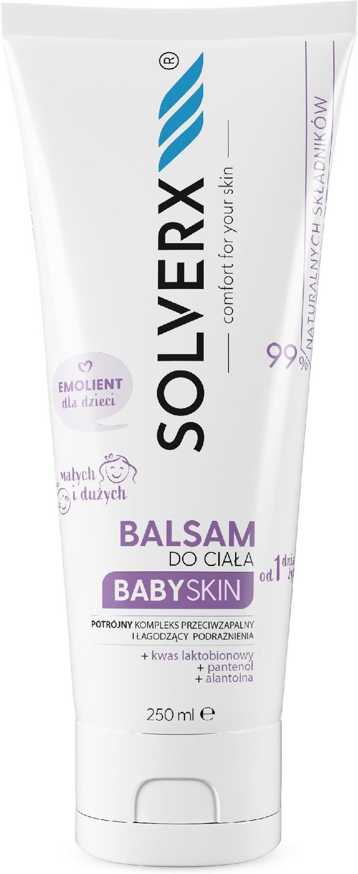 SOLVERX Baby Skin Balsam-Emolient do ciała dla dzieci 250ml Balsam do ciała przeznaczony dla dzieci od pierwszego dnia życia. Receptura oparta o kompleks przeciwzapalny stanowiący połączenie kwasu laktobionowego z pantenolem i alantoiną, łagodzi podrażnienia i skutecznie natłuszcza skórę dziecka. …