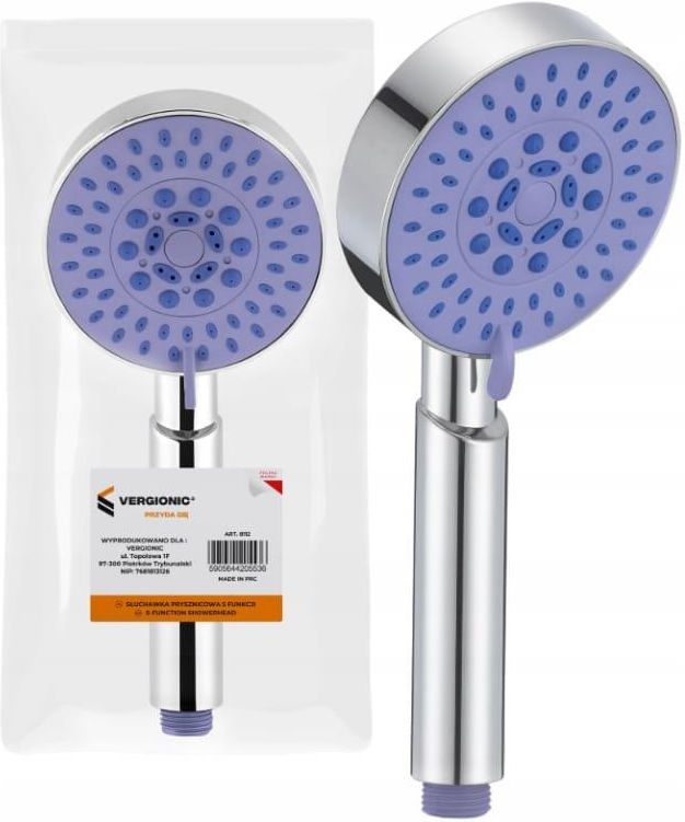 Słuchawka prysznicowa 5 funkcji do wanny, natryskowa VERGIONIC Towar zapakowane fabrycznie przez producenta. W skład zestawu wchodzi Słuchawka prysznicowa 5 funkcji do wanny, natryskowa VERGIONIC Specyfikacja Średnica: 10 cm Długość całkowita: 22,5 cm Długość rękojeści: 12 cm Średnica rękojeści: 2,7 cm Gwint: 1/2″ Kolor: srebrny, fioletowy Waga: 117 g Słuchawka prysznicowa to akcesorium łazienkowe, które oferuje różnorodne opcje natrysku, umożliwiając dostosowanie strumienia wody do indywidualnych potrzeb użytkownika. Dzięki różnym trybom, słuchawka prysznicowa zapewnia komfort i relaks, a także większą oszczędność wody. Wykonana została z wysokiej jakości tworzywa sztucznego w kolorze chromu, który jest odporny na wysoką temperaturę i pęknięcia. Wyposażona została także w mocne uszczelki, które zapobiegają przeciekaniu wody oraz w silikonowe wypustki na dyszach, które ułatwiają usuwanie kamienia wapiennego i zapobiegają jego osadzaniu się. Jakość całego produktu sprawia, że kąpiel staje się łatwa oraz przyjemna. Słuchawka posiada standardowy gwint 1/2″, który pasuje do większości węży prysznicowych. Przeznaczona jest do podłączenia do natrysku łazienkowego – prysznicowego lub wannowego. Jest lekka i poręczna, nie stanowi zatem kłopotu nawet podczas długich chwil w łazience. Słuchawka posiada 5 trybów natrysku Delikatny deszcz – strumień o mniejszej intensywności, idealny do relaksujących pryszniców i oszczędzania wody. Mocny strumień – intensywny strumień, doskonały do szybkiego spłukiwania szamponu lub mydła. Masujący strumień – skierowany w celu delikatnego masażu, co może pomóc w redukcji napięcia mięśniowego. Strumień mgiełki – lekka mgiełka, dająca uczucie chłodzenia, świetna na gorące dni. Strumień pulsacyjny – strumień wody, który rytmicznie zmienia swoją intensywność, idealny dla osób szukających relaksu po ciężkim dniu.