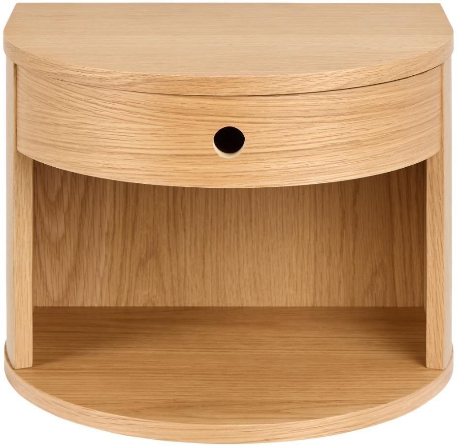 SZAFKA NOCNA PARON II DĄB 40X31,5X30 CM WISZĄCA Ta wisząca na ścianie szafka nocna wyróżnia się półokrągłą formą. Posiada szufladę i otwartą przegrodę, może pomieścić drobne niezbędne rzeczy. Jej lakierowana okleina dębowa podkreśla design stolika, akcentując jego naturalny wygląd. Stanowi doskonałe wykończenie sypialni w stylu skandynawskim. Szafka nocna jest częścią serii PARON, która obejmuje szafki nocne stojące i wiszące. Stolik nocny Paron półokrągły, blat matowy dąb lakierowany fornirem PU, rama i szuflada matowy dąb lakierowany fornirem NC z otwartą przegrodą i mocowaniem ściennym, 40x31,5x30 cm