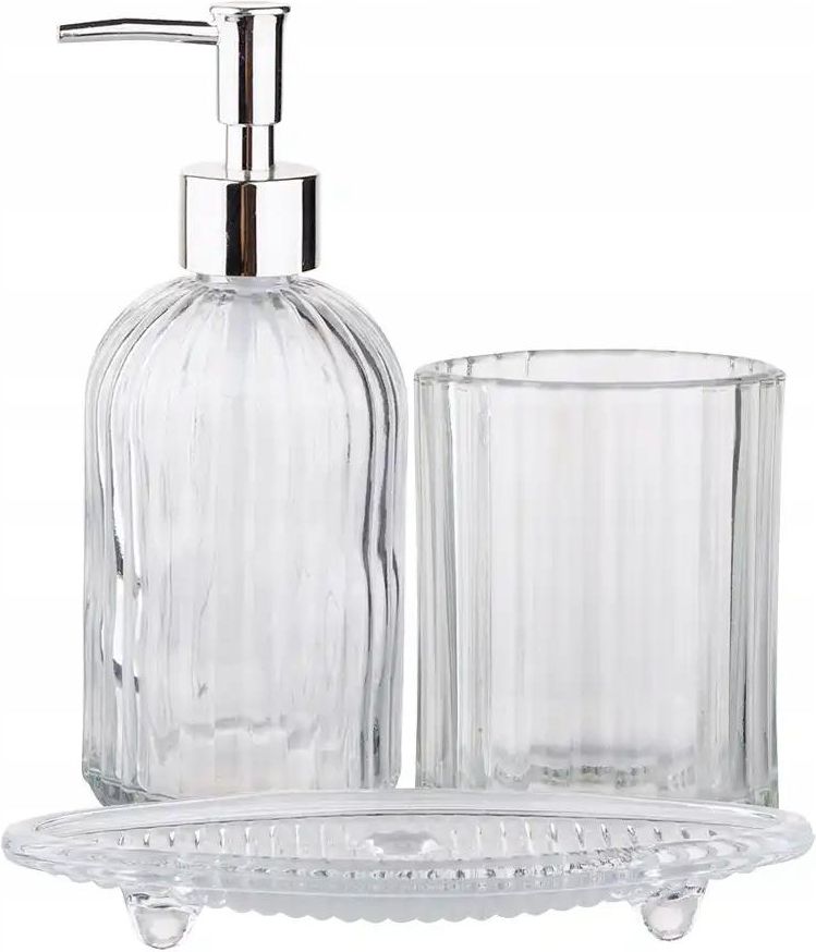 Komplet łazienkowy szklany zestaw mydelniczka kubek pojemnik na mydło Komplet łazienkowy szklany zestaw mydelniczka kubek pojemnik na mydło Elegancki Zestaw Łazienkowy ze Szkła - Połączenie Estetyki i Funkcjonalności Odkryj wyjątkowy zestaw łazienkowy, który łączy w sobie nowoczesny design z praktycznością. Nasze akcesoria wykonane są z wysokiej jakości szkła, co nadaje każdej łazience elegancki i nowoczesny wygląd. Dzięki odporności na wilgoć i działanie chemikaliów, zestaw ten posłuży Ci przez długi czas, nie tracąc przy tym swojego atrakcyjnego wyglądu. CECHY CHARAKTERYSTYCZNE - Trwałość i Odpowiedniość: Szkło to materiał nie tylko estetyczny, ale także niezwykle trwały, co czyni go idealnym wyborem do pomieszczeń narażonych na wilgoć. - Łatwe czyszczenie: Jednolita, gładka powierzchnia szkła sprawia, że zestaw jest łatwy do czyszczenia i dezynfekcji, co znacząco ułatwia utrzymanie higieny w łazience. - Uniwersalne akcesoria: Zestaw składający się z mydelniczki, kubka na szczoteczki oraz dozownika do mydła doskonale wpasuje się w różnorodne aranżacje łazienkowe, spełniając różne potrzeby użytkowników. - Duża głowica pompki: Dzięki innowacyjnemu systemowi, dozownik zawsze zapewnia odpowiednią ilość mydła, co eliminuje marnowanie produktu. - Praktyczne detale: Mydelniczka z rantem skutecznie zapobiega wypadaniu mydła, a kubek z łatwością pomieści szczoteczki oraz pastę do zębów, co czyni ten zestaw idealnym rozwiązaniem dla każdej rodziny. Skład kompletu Dozownik z pompką Wysokość: 19 cm Szerokość: 7,2 cm Pojemność: 410 ml Kubek Średnica: 8 cm Wysokość: 10 cm Mydelniczka Długość: 15,5 cm Szerokość: 10 cm Wysokość: 2 cm