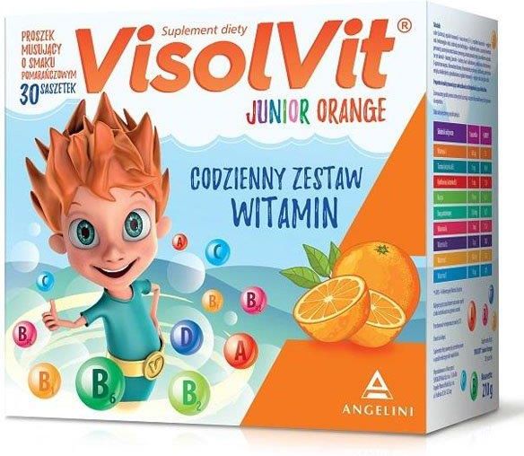 Visolvit Junior Orange proszek o smaku pomarańczowym 10 saszetek Skład Witamina A (palmitynian retynolu) 600 j.m., Witamina D(cholekalcyferol) 10 j.m., Witamina B1 (azotan tiaminy) 1 mg, Witamina B2 (ryboflawina) 1 mg, Witamina B6 (chlorowodorek, pirydoksyny) 1 mg, Witamina B12 (cyjanokobalamina) 5 mikrogramów, Witamina PP (nikotynamid) 10 mg, Witamina C (kwas L-askorbowy) 100 mg, d-pantotenian wapnia 2 mg. Wskazania Preparat stosuje się w stanach wzmożonego zapotrzebowania na witaminy np. okres powrotu do zdrowia po chorobach infekcyjnych, osłabienie organizmu, zwiększony wysiłek fizyczny i umysłowy, a także w profilaktyce niedoboru witamin. Działanie Witamina A jest niezbędna w rozwoju układu nerwowego, w procesach widzenia, wzrostu kości i tworzenia szkliwa zębów. Witamina D3 jest odpowiedzialna za prawidłowy rozwój i mineralizację kości. Witaminy z grupy B, witamina C i kwas pantotenowy biorą udział w przemianach metabolicznych. Niacyna jest niezbędna do prawidłowego funkcjonowania mózgu, obwodowego układu nerwoego, do syntezy hormonów płciowych, hormonów tarczycy i insuliny. Dawkowanie Dzieci i Młodzież od 3 do 17 lat - 1 saszetka w ciągu doby. Rozpuścić saszetkę granulatu w 3/4 szklanki schłodzonej wody.