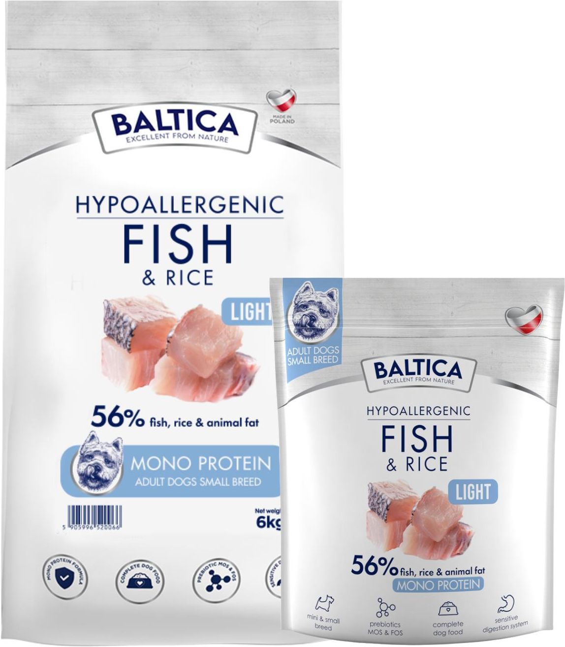 Hipoalergiczna formuła stworzona na bazie suszonego mięsa ryb oraz lekkostrawnego ryżu. Posiłek wzbogacony wyjątkową kompozycją ziół i nutraceutyków o olbrzymich właściwościach prozdrowotnych. Odpowiedni dla psów wybrednych z problemami trawiennymi lub nietolerancją pokarmową. Nie zawiera glutenu, kurczaka oraz roślin strączkowych. Zapewnia uczucie sytości na dłużej, odpowiednia dla zwierząt ze skłonnością do otyłości. Eksperci z zakresu żywienia i dietetyki weterynaryjnej dołożyli wszelkich starań, aby receptura karmy Baltica Fish & Rice Hypoallergenic wychodziła naprzeciw najważniejszym potrzebom zdrowotnym i z dnia nadzień poprawiała komfort życia psów borykających się z problemami z zakresu odporności, układu pokarmowego czy utrzymania prawidłowej masy ciała. Baltica Light Fish & Rice Hypoallergenic zawiera: jedno hipoalergiczne źródło mięsa z ryb oceanicznych lekkostrawny, bezglutenowy ryż wyselekcjonowane warzywa i owoce od polskich, lokalnych dostawców nutraceutyk sorgo, zapewniający uczucie sytości, odpowiedni dla zwierząt ze skłonnością do otyłości owoc dzikiej róży wspierający odporność spirulinę wspomagającą metabolizm i detoksykację organizmu prebiotyki FOS i MOS dbające o prawidłową mikrobiotę jelit kompleks wspierający stawy (chondroityna, glukozamina, MSM) Bukiet wyjątkowych ziół o właściwościach wspomagających prawidłowe funkcjonowanie układu pokarmowego: Mięta uznawana w medycynie naturalnej za klasyk wśród ziół przynoszących ulgę układowi trawiennemu. Pomaga łagodzić ból brzucha, kolki, niestrawność, zaparcia i biegunki. Koper włoski wykazuje działanie rozkurczowe i przeciwbólowe. Poprawia apetyt, przyspiesza wchłanianie składników odżywczych z pożywienia, skracając proces trawienia. Ostropest wspomaga pracę wątroby, która odgrywa kluczową rolę w procesie detoksykacji organizmu. Sorgo (Sorghum Moench) bezglutenowa, afrykańska roślina, która: jest źródłem cennych witamin, makro-, mikroelementów przeciwutleniaczy i polifenoli, dzięki którym wykazuje prozdrowotne właściwości, zapobiega rozwojowi otyłości,zapewniając uczucie sytości przez długi czas, chroni przed insulinoopornością, obniża poziom cholesterolu we krwi, wzmacnia układ odpornościowy i nerwowy, rekomendowana w profilaktyce antynowotworowej. Skład: 25% suszone ryby morskie, 24,5% ryż, 24% sorgo, 6% pulpa buraczana, 6% jabłko, porzeczka, 3% tłuszcz wieprzowy, 2% hydrolizat łososia, olej z łososia, minerały, 1% pietruszka, dzika róża, zioła(ostropest plamisty, mięta, koper włoski),MSM(0,05%),siarczan glukozaminy ( 0,03%), siarczan chondroityny ( 0,015%), MOS, FOS. Wykluczone potencjalne alergeny: białka i tłuszcze zwierzęce inne niż ryby i tłuszcz wieprzowy (w tym kurczak i hydrolizaty białkowe), gluten, chemiczne konserwanty, soja, groch (w tym zielony groszek) oraz inne rośliny strączkowe silnie wzdymające Kaloryczność: 3132 kcal/ 1000g Składniki analityczne: Białko surowe 22%, Tłuszcz surowy 7%, Włókno surowe 4,5%, Popiół 7%, Wilgotność 10%, Wapń 1,7%, Fosfor 1,4% Dodatki dietetyczne/kg: witamina A -14 000 j.m., witamina D3-1000 j.m, żelazo(siarczan żelaza) - 36 mg/kg, cynk(jednowodny siarczan cynku) - 36 mg/kg,miedź(pentahydrat siarczanu miedzi) - 10 mg/kg mangan(tlenek manganu) - 5 mg/kg, jod(bezwodny jodan wapnia) - 1,2 mg/kg, selen(selenin sodu) - 0,1 mg/kg, Dodatki technologiczne/kg: witamina C - 40 mg, witamina E -100 mg, ekstrakt tokoferoli z oleji roślinnych.
