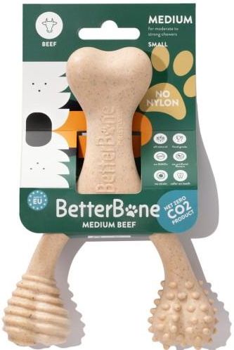 BetterBone Beef Small Medium BetterBone Beef Small Medium to doskonały wybór dla właścicieli psów, którzy szukają trwałej i bezpiecznej zabawki, która dostarczy ich pupilowi niezapomnianej zabawy. Dzięki wyjątkowej twardości i solidnej konstrukcji, ta zabawka jest idealna dla psów, które uwielbiają gryźć i żuć. BetterBone wspiera zdrowie zębów i dziąseł, zapewniając jednocześnie długotrwałą rozrywkę. Zabawka posiada 3 różne końcówki do żucia, każda posiada inną teksturę, co stymuluje zmysły psa, a ponadto przyczynia się do lepszego czyszczenia zębów. Kość BetterBone wykonana została głównie z celulozy spożywczej, którą można bezpiecznie spożywać w niewielkich ilościach. Kluczowe cechy produktu: Smak wołowina - 100% prawdziwej, odwodnionej wołowiny bez sztucznych aromatów Wysoka jakość materiału – wykonana z wytrzymałego tworzywa, odpornego na intensywne gryzienie Bezpieczna dla zębów – pomaga w utrzymaniu zdrowych zębów i dziąseł, redukując ryzyko wystąpienia problemów stomatologicznych Dostosowana do dużych psów – idealna dla psów o wadze 7-18kg, które potrzebują wytrzymałych zabawek Zaspokaja instynkt żucia - wersja MEDIUM przeznaczona dla psów o średniej sile żucia Wykonana z celulozy spożywczej - włókna, które można bezpiecznie spożywać w niewielkich ilościach Łatwa do czyszczenia – utrzymanie jej w czystości jest proste i szybkie Kość łuszczy się, a nie odpryskuje - ta cecha zmniejsza ryzyko zadławienia Produkowany wyłącznie w Europie - spełnia wszelkie przepisy UE Kości wolne od szkodliwych i toksycznych substancji - nie zawiera ftalanów, parabenów, BPA, substancji rakotwórczych i mutagenów Skład: 100% naturalna celuloza (wolna od GMO), olej roślinny (bez cukru) oraz wołowina. Wymiary: 15,2 x 10,8 x 3,2cm Waga: 94g