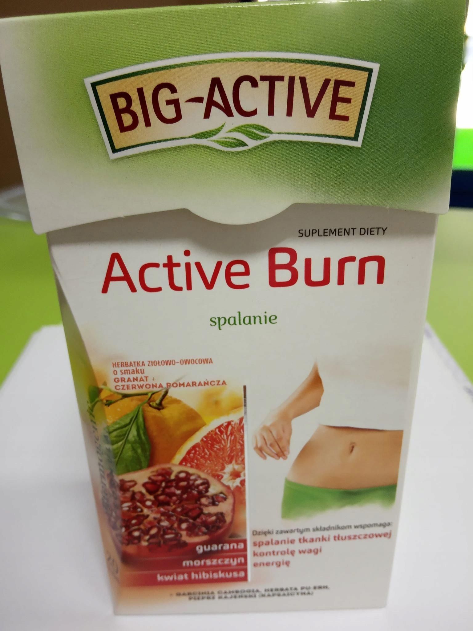 Active Burn spalanie. Suplement diety. Herbatka ziołowo-owocowa o smaku granat + czerwona pomarańczaActive Burn spalanie suplement diety to kompozycja wielu składników m.in.: nasion guarany, morszczynu i kwiatu hibiskusa. Nasiona guarany: - wspomagają metabolizm i spalanie tłuszczów, ułatwiając kontrolę wagi ciała. Morszczyn: - pomaga w utrzymaniu prawidłowej masy ciała, - zwiększa uczucie sytości i pełności, - wspiera metabolizm energetyczny, - jest naturalnym źródłem jodu. Jod: - przyczynia się do utrzymania prawidłowego metabolizmu energetycznego. Kwiat hibiskusa: - przyczynia się do prawidłowego funkcjonowania układu moczowego, - ma korzystny wpływ na witalność organizmu i właściwy poziom energii, - pomaga zmniejszyć objawy fizycznego i psychicznego zmęczenia.Spróbuj także herbatek: Big-Active Slim Plus Anti YoYo odchudzanie i stabilizacja wagi Wszystkie produkty z tej linii kupisz na www.smacznaherbata.pl Składniki: kwiat hibiskusa (55%), herbata Pu-Erh (12%), jabłko, nasiona guarany (7,5%), aromaty, morszczyn (2,5%), wyciąg z Garcinia cambogia (2%), nasiona granatu (1%), skórka czerwonej pomarańczy (1%), wyciąg z pieprzu kajeńskiego (1,3%) Napar z 3 torebek po 2 g (dzienna porcja produktu): Składniki aktywne:, Nasiona guarany: 450 mg, Morszczyn: 150 mg, w tym jod: 93,3 µg (62,2% RWS*), Kwiat hibiskusa: 3,3 g, Wyciąg z Garcinia cambogia: 120 mg, Ekstrakt z pieprzu kajeńskiego: 78 mg, w tym kapsaicyna: 6,2 mg, *RWS - referencyjna wartość spożycia Sposób przygotowania: 1 torebkę zalać szklanką gorącej wody. Zaparzać pod przykryciem przez ok. 5-7 min. Zalecane spożycie: pić 3 razy dziennie napar z 1 torebki. Korzystny efekt wynikający z deklarowanego działania występuje w przypadku spożycia naparu z 3 torebek dziennie. Nie należy przekraczać zalecanej porcji do spożycia w ciągu dnia. Produkt nie może być stosowany jako substytut (zamiennik) zróżnicowanej diety. Zrównoważona i zróżnicowana dieta oraz zdrowy styl życia są podstawą zapewnienia prawidłowego funkcjonowania organizmu.Przechowywać w suchym miejscu w temp. pokojowej, w sposób niedostępny dla małych dzieci. Przebarwienia saszetek pochodzące od pigmentów roślinnych nie stanowią wady wyrobu.Przechowywać w temperaturze otoczenia Nie stosować u osób uczulonych na którykolwiek ze składników produktu. Produkt nie powinien być stosowany przez dzieci, kobiety w okresie ciąży i karmienia piersią. Osoby przyjmujące leki przed spożyciem produktu powinny skonsultować się z lekarzem. Suplement diety nie może być stosowany jako substytut (zamiennik) zróżnicowanej diety. Suplementy diety powinny być przechowywane w sposób niedostępny dla małych dzieci. Dane producenta: Big-Active Sp. z o.o., ul. Bobrowiecka 6, 00-728 Warszawa, www.big-active.pl