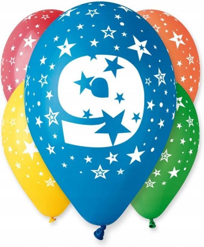Nazwa: Balon 12" z nadr. "9", pastel mix / 5 szt. Producent: GoDan Kod Produktu GS110/9 Opis Produktu: "BALONY PASTELOWE Z NADRUKIEM - "9" Włoskiego producenta - firmy Gemar. posiadają odpowiedniej długości końcówkę, więc nie ma problemów z ich wiązaniem. W opakowaniu znajduje się 5 pastelowych różnokolorowych balonów z cyfrą "9" Każdy balon ma po napompowaniu ok. 30 cm! Balony posiadają również białe ozdobne gwiazdki.