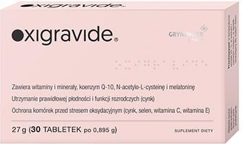 Oxigravide 30tab wspomaganie prawidłowej płodności Podstawowe informacje o Oxigravide Oxigravide kompleks przeciwutleniaczy, witamin i minerałów dla kobiet, przeznaczony do wspomagania prawidłowej płodności i funkcji rozrodczych. Działanie i właściwości Oxigravide to produkt przeznaczony dla kobiet w wieku rozrodczym, a korzystny efekt występuje w przypadku codziennego uzupełniającego spożycia dawki wynoszącej 400 μg kwasu foliowego przez co najmniej jeden miesiąc przed poczęciem i maksymalnie trzy miesiące po poczęciu. Cynk pomaga w utrzymaniu prawidłowej płodności i prawidłowych funkcji rozrodczych. Cynk, Selen, Witamina C, Witamina E pomagają w ochronie komórek przed stresem oksydacyjnym. Uzupełniające spożycie kwasu foliowego zwiększa poziom folianów u matki. Korzystny efekt uzyskuje się przy suplementacji kwasu foliowego w dziennej dawce 400 μg przez co najmniej jeden miesiąc przed i do trzech miesięcy po zapłodnieniu. Zastosowanie / wskazania Oxigravide to suplement diety przeznaczony dla kobiet w wieku rozrodczym. Składniki Fosforany wapnia, celuloza mikrokrystaliczna, żel celulozowy; koenzym Q-1O (ubichinon); kwas L-askorbinowy (witamina C); N-acetylo-L-cysteina; kwas pteroilomonoglutaminowy (kwas foliowy); cytrynian cynku; drożdże wzbogacone w selen; substancja przeciwzbrylająca: sole magnezowe kwasów tłuszczowych, dwutlenek krzemu [nano]; substancje zagęszczające: hydroksypropyloceluloza, hydroksypropylometyloceluloza, substancja przeciwzbrylajca: talk; barwniki: węglan wapnia, kwas karminowy, karmin; bursztynian D-alfa-tokoferylu (witamina E); sól glukozaminowa kwasu (6S)- 5-metylotetrahydrofoliowego (kwas foliowy), chlorowodorek pirydoksyny (witamina B6;); melatonina; beta-karoten (witamina A). Dawkowanie Oxigravide 1 tabletka dziennie przed pójściem spać, popić 1 szklanką wody (200 ml). Nie przekraczać zalecanej porcji do spożycia w ciągu dnia. Przeciwwskazania Przechowywać w suchym miejscu w temperaturze pokojowej (15 - 25°C) w sposób niedostępny dla małych dzieci. Zaleca się chronić przed działaniem wilgoci i światła. Działania niepożądane / skutki uboczne Brak informacji dotyczących skutków ubocznych czy działań niepożądanych. Ostrzeżenia i środki ostrożności Nie stosować w przypadku uczulenia lub nadwrażliwości na którykolwiek ze składników. Przechowywanie Przechowywać w temperaturze poniżej 25°C w suchym i ciemnym miejscu, chronić przed małymi dziećmi. Pojemność 30 tabletek