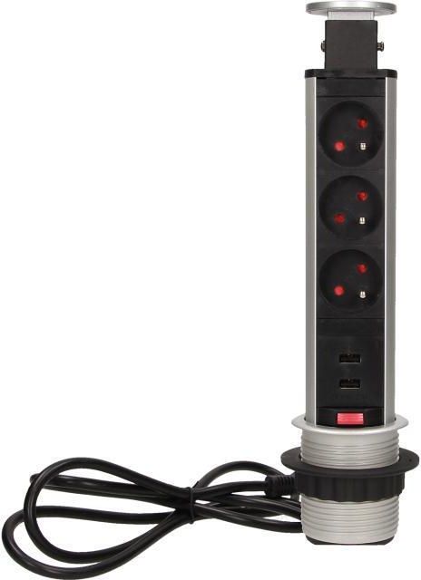 Orno Gniazdo meblowe fi6cm, 3x250V AC wysuwane z blatu z ładowarką USB, blokadą i przewodem 1,8m srebrne OR-AE-1349 Żory