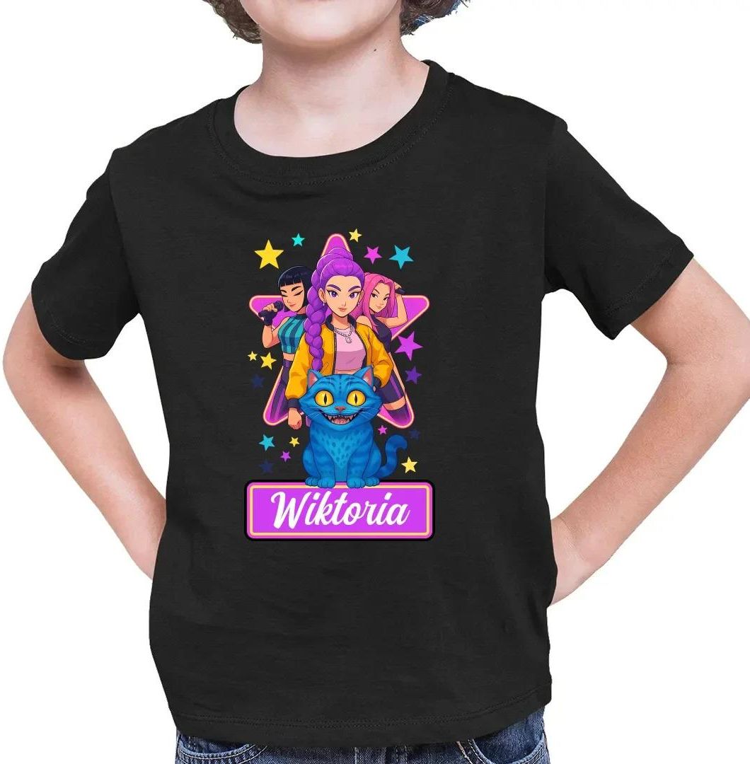 Rumi, Mira i Zoey - Huntrix - dziecięca koszulka na prezent dla fanów filmu KPop Demon Hunters - produkt personalizowany Żory