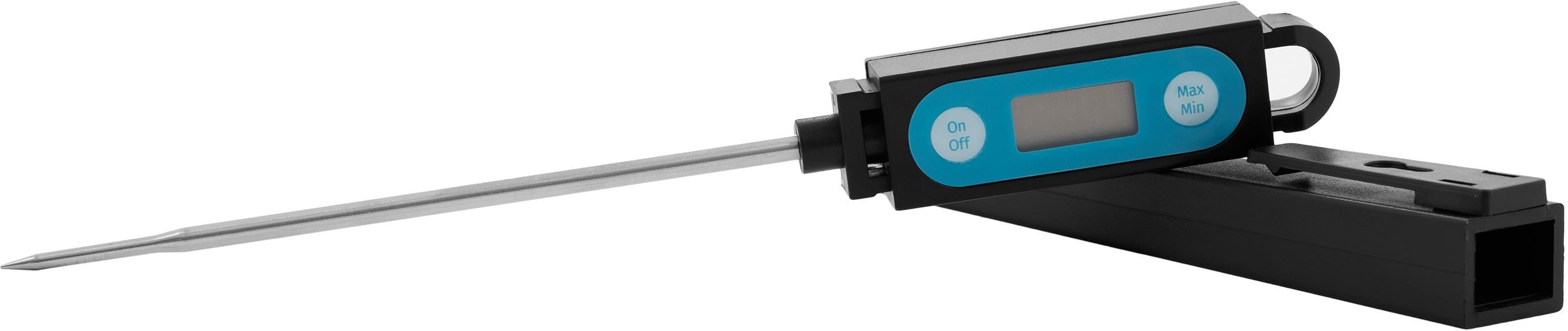 Uniwersalny termometr elektroniczny do pomiaru temperatury wewnątrz mięs i innych produktów żywnościowych. Termometr wykonany w wysokiej jakoś tworzywa oraz stali nierdzewnej gwarantuje długie użytkowanie. Dokładność: ± 1°C przy pomiarach -19.9 ~ 119,9 °C ± 2°C przy pomiarach -50 ~ -20 °C oraz 120 ~ 199,9 °C Cyfrowy moduł pomiarowy poddany certyfikacji CE, dokładny i z szerokim zakresem mierzonych temperatur oraz możliwością zmiany °C na F, będzie idealnym wsparciem na każdej kuchni. Sonda bagnetowa ze stali nierdzewnej (304) od długości 115 mm i średnicy 3,8 mm. Pomiar temperatury w ciągu jednej sekundy Osłona sondy, ergonomiczny uchwyt wykonany z wytrzymałego termopolimeru Automatyczne wyłączanie termometru po 45 minutach Wodoodporność i pyłoodporność: IP65 Baterie w zestawie (LR44/AG13) Obsługa: Wybierz jednostkę pomiaru klikając odpowiedni przycisk (°C lub °F). Pomiar temperatury: Wbij sondę bagnetową w produkt na około 25mm grubości lub zanurz w cieczy, odczytaj temperaturę gdy się ustabilizuje na wyświetlaczu LCD. Ważne informacje: Żeby skasować historię pomiarów należy przycisnąć i przytrzymać przycisk MAX/MIN przez 3 sekundy. Zawsze kasuj historie pomiarów przed nowymi pomiarami, żeby odczyty były dokładne. Zawsze czyść sondę bagnetową przed kolejnymi pomiarami, aby zapobiec zanieczyszczeniu kolejnych produktów. Upewnij się, że po zmianie baterii klapka zabezpieczająca jest dobrze dokręcona, w celu uniknięcia wilgoci i brudu w środku urządzenia. Gdy wyświetlacz LCD zaczyna przygasać należy niezwłocznie wymienić baterię na nową, zgodną opisem produktu. Nigdy nie korzystaj z termometru w niesprzyjających temperaturach (niższej niż 0 °C lub wyższej niż 50 °C) - może to spowodować błędne odczyty lub uszkodzenie urządzenia.