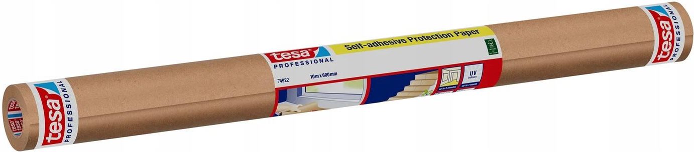 Tesa® 74922 Samoprzylepny papier ochronny 600mm/10mSamoprzylepny papier ochronny tesa® – do zabezpieczania i pokrywania dużych powierzchni Opis produktu Samoprzylepny papier ochronny tesa® to profesjonalnej jakości papier kraftowy, idealny do zabezpieczania dużychpowierzchni podczas prac malarskich lub remontowych. Zapewnia łatwą i skuteczną ochronę przed rozlaniem farbyi zadrapaniami na różnych powierzchniach, takich jak parapety, schody, podłogi i blaty. Jest łatwy do nałożenia,przesuwania i odklejania bez pozostawiania substancji klejącej, co oznacza bezproblemowe czyszczenie. Aspekty zrównoważonego rozwoju Samoprzylepny papier ochronny tesa® jest wytwarzany z papieru pochodzącego z odpowiedzialnie zarządzanychlasów i innych kontrolowanych źródeł. Spełnia standardy FSC® dla recyklingowanego papieru, ponieważ jest wykonanyw 100% z włókien z recyklingu. Wybierając ten papier ochronny, aktywnie wspierasz ochronę lasów i dokonujeszodpowiedzialnego środowiskowo wyboru. Pomaga oszczędzać cenne zasoby i sprzyja recyklingowi – idealny dlakażdego, kto w swoich projektach ceni jakość i zrównoważony rozwój. Osłaniaj swoje powierzchnie w odpowiedzialnysposób, wybierając samoprzylepny papier ochronny tesa®!Ważna uwaga: Informacja o certyfikacie FSC® dotyczy wyłącznie firm posiadających certyfikat FSC® (FSC® C148769). Cechy • Łatwa aplikacja, zapewniająca ochronę nawet najbardziej delikatnych powierzchni przed zabrudzeniami, kurzemi drobnymi odpryskami farby• Czyste usuwanie bez pozostawiania śladów – do 1 miesiąca• Możliwość wielokrotnego nakładania• W pełni powlekany nośnik zwiększający trwałość i wydajność• Gładki i gruby papier kraftowy zapobiegający przenikaniu farby• W skład zestawu wchodzą: 1 rolka samoprzylepnego papieru ochronnego tesa Ocena właściwości wydłużenie przy zerwaniu 2.5 % odporność na rozciąganie 500 N/cm Odporność UV do wnętrz 90 g/m² Materiał Papier materiał dobrze maskujący papier nadaje się do delikatnych powierzchni yes usuwanie bez pozostawiania śladów tak Application temperature from 5 °C łatwo usuwalna tak Odporność na rozdarcie nie Waga nośnika 4 weeks odporność na wilgoć niska Temperatura stosowania do 60 °C Bez rozpuszczalników tak Usuwanie bez śladu do ... dni 90 days wodoodporność nie