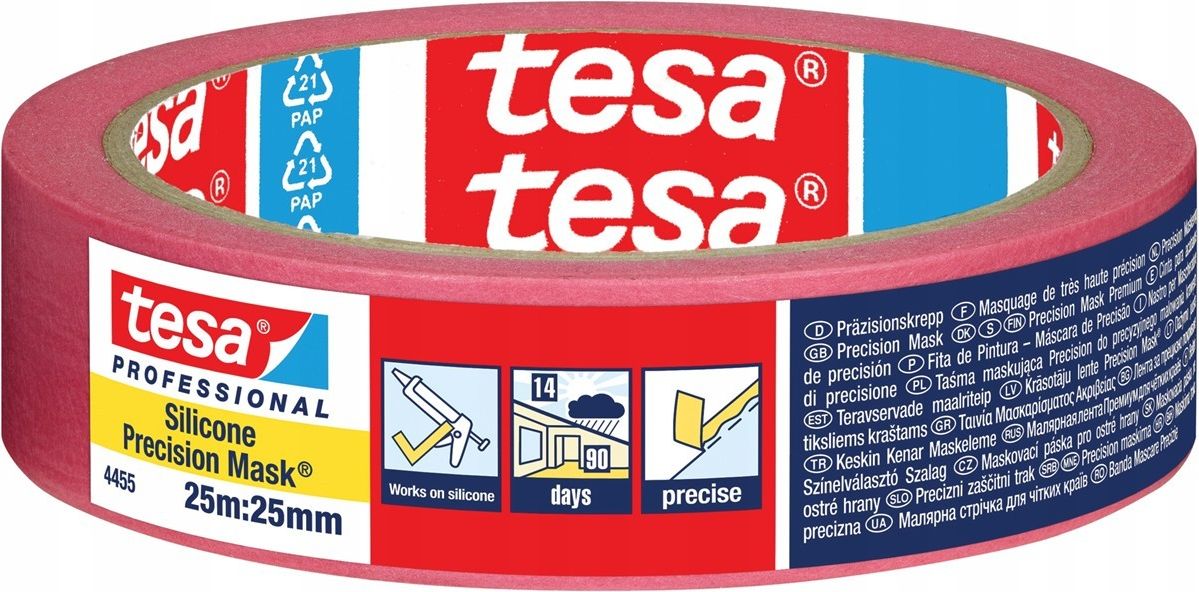Taśma Malarska Silikonowa Maskująca Tesa Precision Mask 25 mm x 25 m Najważniejsze cechy produktu Precyzyjne maskowanie – zapewnia ostre, płaskie krawędzie farby nawet na trudnych powierzchniach. Szerokie zastosowanie – doskonała do powierzchni silikonowych, antygraffiti i odpornych na zabrudzenia. Odporność UV – wytrzymuje do 90 dni wewnątrz i 14 dni na zewnątrz bez utraty właściwości. Łatwe usuwanie – nie pozostawia śladów kleju, nawet po długim czasie aplikacji. Cienki, wytrzymały papier washi – zapewnia elastyczność i idealne dopasowanie. Precyzja bez kompromisów Perfekcyjne krawędzie, zero podcieków. Taśma tesa® 4455 Silicone Precision Mask to wysokiej klasy papierowa taśma maskująca, zaprojektowana specjalnie do prac malarskich i lakierniczych na trudnych, odpornych na zabrudzenia powierzchniach. Dzięki cienkiemu nośnikowi z papieru washi i klejowi silikonowemu, gwarantuje czyste linie i łatwe usuwanie bez uszkadzania podłoża. Wszechstronność i niezawodność Działa tam, gdzie inne taśmy zawodzą. Doskonale przylega do powierzchni silikonowych, antygraffiti, gładkich i lekko teksturowanych. Dzięki odporności na promieniowanie UV i warunki zewnętrzne, zachowuje swoje właściwości nawet przez 90 dni. Idealna do precyzyjnego maskowania w pracach malarskich, lakierniczych i renowacyjnych. Profesjonalny standard tesa Zaufanie ekspertów branży. tesa® 4455 łączy precyzję, trwałość i bezpieczeństwo użytkowania, zapewniając najwyższy poziom jakości. Każda rolka spełnia rygorystyczne normy testowe tesa®, co gwarantuje powtarzalne, perfekcyjne rezultaty przy każdym projekcie malarskim – zarówno w warsztacie, jak i na budowie