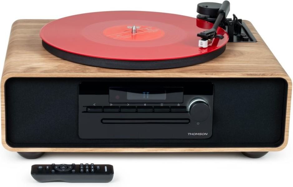 ZESTAW: Gramofonem z głośnikami Bluetooth, radiem FM, odtwarza płyty CD/MP3 Thomson MIC300TT/902DUO Połączenie mikrowieży Thomson MIC300TT z aktywnymi głośnikami półkowymi Thomson WS902DUO to idealne rozwiązanie dla osób, które cenią sobie zarówno klasyczne brzmienie winyli, jak i nowoczesne technologie audio. Zestaw oferuje szerokie możliwości odtwarzania, mocny i dynamiczny dźwięk oraz elegancki design, który wpasuje się w każde wnętrze. Mikrowieża Thomson MIC300TT – klasyka w nowoczesnej formie System all-in-one MIC300TT łączy funkcjonalność i styl. Gramofon z napędem paskowym obsługuje płyty 33 i 45 RPM (adapter w zestawie), a wysokiej jakości wkładka Audio-Technica AT3600L gwarantuje czysty i zrównoważony dźwięk. Funkcja auto-stop zatrzymuje talerz po zakończeniu odtwarzania, a możliwość nagrywania winyli bezpośrednio na USB pozwala digitalizować kolekcję w formacie MP3. Wieża obsługuje różne źródła muzyki: Bluetooth 5.0, wbudowany odtwarzacz CD, radio FM (50 zapamiętanych stacji), pliki MP3 z USB oraz wejście AUX 3,5 mm. Dzięki dołączonemu pilotowi wszystkie funkcje są łatwo dostępne, a wbudowany korektor umożliwia dopasowanie brzmienia do własnych preferencji. Drewniane wykończenie w stylu „light oak” i solidna pokrywa przeciwkurzowa czynią MIC300TT eleganckim i praktycznym urządzeniem. Głośniki WS902DUO – moc i personalizacja dźwięku Aktywne głośniki półkowe WS902DUO oferują moc 150 W, dzięki czemu zapewniają dynamiczne, pełne brzmienie odpowiednie do każdego rodzaju muzyki czy filmów. Szeroki wybór złączy i technologii łączności gwarantuje pełną kompatybilność z większością urządzeń: Bluetooth 5.3 dla stabilnych połączeń bezprzewodowych, wejścia TV Audio, optyczne i RCA – do telewizora, gramofonu czy odtwarzacza CD, USB (MP3) do odtwarzania muzyki z pamięci, AUX-OUT i wyjście subwooferowe dla dodatkowych urządzeń audio. Dzięki wbudowanemu equalizerowi z trybami „Film”, „Muzyka” i „Głos” oraz pokrętłom regulacji tonów niskich, wysokich i głośności, możesz w pełni dostosować brzmienie do swoich preferencji. Drewniana obudowa i nowoczesny design sprawiają, że WS902DUO są zarówno źródłem świetnego dźwięku, jak i stylowym elementem wystroju. Bluetooth 5.3 Całkowita moc muzyczna: 150 W Wejście TV Audio Wejście optyczne (kabel w zestawie) Wyjście subwoofera 3,5 mm (kabel w zestawie) Wejście USB (MP3) Wejście RCA (kabel RCA-RCA w zestawie) Niezależna regulacja tonów wysokich i niskich Korektor dźwięku (tryby: muzyka, film, głos) Pilot zdalnego sterowania (2 baterie AAA – brak w zestawie) Zasilacz 230 V w zestawie Wymiary jednego głośnika: 15 × 17 × 43 cm (szer. × gł. × wys.) Kompletny zestaw audio Razem MIC300TT i WS902DUO tworzą kompletny system HiFi, który pozwala cieszyć się muzyką z płyt winylowych, CD, radia i nowoczesnych źródeł cyfrowych w najwyższej jakości. To idealne połączenie klasyki i nowoczesności – w pięknej formie i z mocnym, przestrzennym brzmieniem. Thomson MIC300TT to elegancki i wszechstronny system audio typu all-in-one, który łączy klasyczne brzmienie winyli z nowoczesnymi funkcjami. Urządzenie wyposażone jest w gramofon z napędem paskowym, obsługujący płyty 33 i 45 obrotów, a także posiada funkcję auto-stop oraz solidną pokrywę przeciwkurzową, która chroni delikatne elementy gramofonu. Zainstalowana wkładka gramofonowa zapewnia czysty i zrównoważony dźwięk, a możliwość nagrywania z płyt winylowych na USB pozwala na łatwą digitalizację ulubionych kolekcji. Wieża oferuje również szerokie możliwości odtwarzania – Bluetooth 5.0 umożliwia szybkie i stabilne połączenie ze smartfonem lub tabletem, a wbudowany odtwarzacz CD, radio FM z pamięcią stacji oraz wejścia USB i AUX dają dostęp do wielu źródeł muzyki. Sterowanie ułatwia dołączony pilot, dzięki któremu można wygodnie obsługiwać wszystkie funkcje bez wstawania. Nowoczesne wzornictwo z drewnianym wykończeniem sprawia, że MIC300TT idealnie wpasuje się w każde wnętrze, łącząc styl i funkcjonalność w kompaktowej formie. Design & wykonanie Nowoczesna, przytulna stylistyka z zaokrąglonymi krawędziami i subtelnym wykończeniem w stylu „light oak” doskonale wpasowuje się w modne wnętrza. Solidna pokrywa przeciwkurzowa wykonana z tworzywa EVA skutecznie chroni talerz gramofonu oraz wkładkę przed zabrudzeniem. Gramofon Napęd paskowy (belt-drive) zapewnia stabilne obroty i płynne odtwarzanie winyli. Obsługa płyt 33 i 45 obrotów na minutę (adapter 45 RPM w zestawie). Ręczne ramię z regulowaną przeciwwagą umożliwia precyzyjne śledzenie rowka płyty i ograniczenie zniekształceń. Wysokiej jakości wkładka Audio-Technica AT3600L (z igłą ATN3600L) – wymienna, znana z dobrej reprodukcji dźwięku. Funkcja auto-stop (włączana/wyłączana) automatycznie zatrzymuje obracanie talerza po zakończeniu odtwarzania. Możliwość digitalizacji nagrań – zapis muzyki z winyli bezpośrednio na USB w formacie MP3. Łączność i sterowanie Bluetooth 5.0 pozwala na szybkie i stabilne połączenie ze smartfonem, tabletem lub laptopem. Pilot zdalnego sterowania umożliwia wygodne sterowanie wszystkimi funkcjami urządzenia. Bogaty wybór złączy: AUX-IN (3,5 mm), USB-A (do odtwarzania plików MP3 i ładowania urządzeń), wyjścia RCA oraz tuner FM z możliwością zapisania 50 stacji. Wbudowany odtwarzacz CD, tuner FM i korektor dźwięku zapewniają uniwersalne zastosowanie. Parametry techniczne : Bluetooth 5.0 radio FM wyrównywacz pilot zdalnego sterowania (2 baterie AAA nie są dołączone) pamięć na 50 stacji radiowych odtwarzacz CD wyświetlacz zegara Wejście AUX-IN 3,5 mm (kabel w zestawie) Port USB (do odtwarzania plików MP3) Port ładowania USB (5V-1A) Wyjście RCA gramofon napędzany paskiem Wkładka Audio-Technica AT3600L prędkość 33/45 obr./min. możliwo