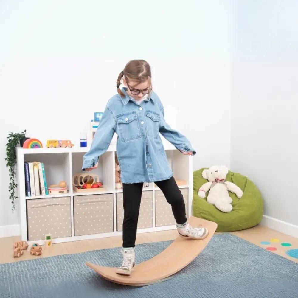 Drewniana deska do balansowania TickiT Drewniana deska do balansowania TickiT to wyjątkowe narzędzie wspierające rozwój motoryczny dzieci w różnym wieku. Wykonana z trwałej sklejki bukowej, posiada filcową warstwę od spodu, co zapewnia stabilność i bezpieczeństwo podczas zabawy. Ta wytrzymała deska do balansowania zachęca do aktywności fizycznej i pomaga rozwijać zdolności motoryczne, równowagę oraz koordynację ruchową. Korzyści z zabawy na desce do balansowania obejmują: Rozwój motoryki dużej: stawianie stóp na desce i balansowanie na niestabilnej powierzchni wspiera rozwój mięśni nóg, ramion i tułowia, rozwijając przy tym motorykę dużą. Ćwiczenia na desce są przydatne także w pracy nad wzmocnieniem stabilizacji centralnej i stabilizacji stawów kończyny dolnej (stawu skokowego, kolanowego i biodrowego). Dzięki temu deska do balansowania jest sprzętem niezbędnym w gabinecie fizjoterapii dziecięcej. Doskonalenie równowagi: ćwiczenia na desce stymulują układ przedsionkowy, przez co pomagają w usprawnianiu reakcji równoważnych. To ważne w kontekście prawidłowego rozwoju ruchowego. Wzmacnianie koordynacji ruchowej: kontrolowanie ruchów ciała podczas balansowania na desce wspiera rozwój koordynacji ruchowej. Wpływa to korzystnie na ogólną sprawność fizyczną. Aktywność fizyczna: Zabawa na desce zachęca dzieci do aktywności fizycznej, co jest istotne dla ogólnego zdrowia i dobrej kondycji. Deska do balansowania TickiT znajdzie zastosowanie w różnych placówkach, takich jak: Przedszkola: jest to doskonałe narzędzie wspierające rozwój motoryczny dzieci w wieku przedszkolnym. Szkoły podstawowe: balansowanie może być jednym z elementów zajęć wychowania fizycznego jako forma ćwiczeń wspierających rozwój motoryczny i równowagę. Gabinety fizjoterapeutyczne i pedagogiczne: deska może być wykorzystywana w terapii ruchowej do wspierania rozwoju motorycznego i równowagi, a także napięcia mięśniowego. Sale SI: deska do balansowania to świetny element zajęć z integracji sensorycznej, wspomagający rozwój prawidłowych mechanizmów przetwarzania bodźców przedsionkowych. Przykłady te pokazują, że drewniana deska do balansowania TickiT to wszechstronne narzędzie wspierające rozwój motoryczny dzieci, które może być używane w różnych środowiskach edukacyjnych i terapeutycznych. [ikony-produktu-opisy] Pomysły na zabawę „Zbieranie skarbów” – doskonalenie równowagi, rozwój motoryki dużej i koordynacji ruchowej, wzmacnianie koncentracji uwagi Dziecko stoi na desce do balansowania, trzymając równowagę. Terapeuta lub rodzic podaje drobne przedmioty z różnych stron. Mogą to być kolorowe klocki, zabawki, piłeczki, czy figurki. Dziecko musi utrzymać równowagę i jednocześnie chwytać podane przedmioty, starając się umieścić je w pojemniku stojącym na podłodze obok deski. Dodatkowo dziecko może skupić się na kształtach, kolorach i teksturach chwytanych przedmiotów, co wzbogaci zabawę pod względem integracji sensorycznej. „Równowaga i zręczność” – rozwijanie motoryki dużej, doskonalenie reakcji równoważnych, koordynacji ruchowej i koncentracji Umieść deskę do balansowania na podłodze. Wyznacz na przeciwległym końcu pokoju lub na ścianie cel, np. dużą tarczę z piłeczkami na rzep. Poproś dziecko, aby stanęło na desce do balansowania w pozycji równowagi. Terapeuta lub rodzic znajduje się obok dziecka i podaje dziecku piłeczki. Dziecko musi celnie rzucać piłeczkami w kierunku wyznaczonego celu. Terapeuta może dostosować trudność, zmieniając odległość między dzieckiem a celem. Zachęcaj dziecko do zachowania równowagi podczas celowania. Ta zabawa nie tylko rozwija umiejętności zręcznościowe i koordynację, ale również angażuje dziecko w aktywność fizyczną i motywuje je do osiągania celów. Co zawiera? W zestawie znajduje się: Drewniana deska do balansowania TickiT instrukcja użytkowania i pielęgnacji deski do balansowania. Główne informacje Rozmiar: 83 x 30 cm Materiał: sklejka bukowa, filc Wiek: bez ograniczeń wiekowych Wymiary opakowania: 93 x 31 x 3 cm Instrukcja