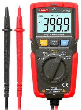 Wielofunkcyjny miernik prądu, napięcia Multimetr kompaktowych rozmiarów, posiadający duży podświetlany wyświetlacz pozwalający na pracę niemal w każdych warunkach oświetleniowych. Pomiar napięcia AC/DC do 600V, Pomiar prądu AC/DC Pomiar rezystancji do 40M Sprawdzanie ciągłości obwodu - brzęczyk Wykrywanie jednym przewodem napięcia Zamrożenie ostatniego wskazania Podświetlany wyświetlacz Automatyczne wyłączenie po 15 minutach bezczynności HOLSTER – gumowa osłona Automatyczna zmiana zakresów pomiarowych Maksymalny odczyt: 4000 Zasilanie: bateria 2x 1,5 V (R03) Rozmiar wyświetlacza: 38 x 23 mm Wymiary produktu: 112 x 58 x 35 mm Waga produktu: 180 g Dane techniczne Miernika UT125C Napięcie stałe DC: 400 mV / 4 V / 40 V / 400 V / 600 V Napięcie zmienne AC: 4 V / 40 V / 400 V / 600 V) Natężenie prądu stałego DC: 400 µA / 4 mA / 40 mA / 400 mA Natężenie prądu zmiennego AC: 400 µA / 4 mA / 40 mA / 400 Rezystancja: 400 Ohm / 4 kOhm / 40 kOhm / 400 kOhm / 4 MOhm / 40 MOhm Pojemność: 50 nF / 500 nF / 5 µF / 50 µF / 100 µF Częstotliwość: 9,999 Hz ~ 60 kHz Współczynnik wypełnienia: 20%~80% Test diod Sprawdzanie ciągłości obwodu Zestaw zawiera Miernik UNI-T UT125C Kable pomiarowe (nieodpinane) Bateria