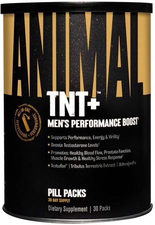 Animal TNT+ to kompleksowy pakiet dla zdrowia i dobrego samopoczucia mężczyzn, opracowany w celu naturalnego wspierania zdrowego poziomu testosteronu, wzrostu beztłuszczowej masy mięśniowej, siły i wytrzymałości. Dzięki potężnej liczbie składników potwierdzonych badaniami TNT+ jest idealnym suplementem dla mężczyzn szukających przewagi na siłowni i poza nią. Kompleks wzmacniający testosteron i męskość Wspiera wydajność treningu, regenerację mięśni i zdrowie prostaty Pomaga obniżyć poziom kortyzolu, aby radzić sobie z codziennym stresem TNT+ zwiększa poziom wolnego testosteronu, pomaga budować masę mięśniową i wspomaga pracę układu sercowo-naczyniowego. Ta naukowo opracowana formuła łączy zastrzeżone i przebadane składniki, takie jak Testofen® i Nitrosigine®, z potężnym adaptogenem Ashwagandha, a także super ziołami, takimi jak Saw Palmetto, Maca, Tribulus, Horny Goat Weed i inne. Zdrowa prostata jest kluczowa dla zdrowia mężczyzny. Dlatego TNT+ zawiera mieszankę Saw Palmetto i zielonej herbaty w naszym kompleksie wspierającym prostatę. TNT+ zawiera również Ashwagandhę, zioło ajurwedyjskie, które może pomóc obniżyć poziom kortyzolu (hormonu stresu w organizmie) i pomóc w radzeniu sobie z codziennym stresem. Ashwagandha może również pomóc zwiększyć VO2max — czyli ilość tlenu, którą organizm może wykorzystać podczas ćwiczeń. Testofen® standaryzowany ekstrakt z kozieradki, który pomaga zaspokoić zapotrzebowanie na testosteron. Jest on łączony z tradycyjnymi ziołami Tribulus Terrestris, Horny Goat Weed i Eurycoma Longifolia. Nitrosigine® zwiększa tlenek azotu, co wspomaga większy przepływ krwi, co prowadzi do lepszych pomp i większej waskularyzacji. Wykazano również, że Nitrosigine® zmniejsza markery uszkodzeń mięśni spowodowanych ćwiczeniami, pomagając poprawić regenerację mięśni. TNT+ to męski zestaw wspomagający zdrowie, męskość i wydajność, który utrzymuje szczytową wydajność Sposób użycia: Przyjmować 1 opakowanie ze śniadaniem lub innym posiłkiem