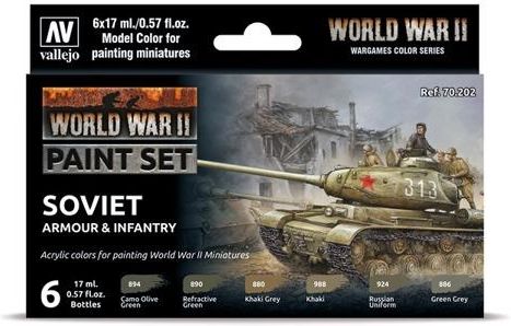 Vallejo 70202 - Zestaw 6 farb Model Color - WWII Soviet Armour & Infantry Ten zestaw, zapewnia specjalistyczne kolory potrzebne do pomalowania radzieckich sił zbrojnych podczas II wojny światowej, umożliwiając pomalowanie np. czołgów T-64, śmigłowców Hind i piechoty na odpowiednie kolory. Zawartość zestawu to 6 farb akrylowych Model Color do malowania modeli w buteleczkach o pojemności 17 ml: 0.894 Camouflage Olive Green 70.890 Refractive Green 70.880 Khaki Grey 70.988 Khaki 70.924 Russian Uniform WWII 70.886 Green Grey