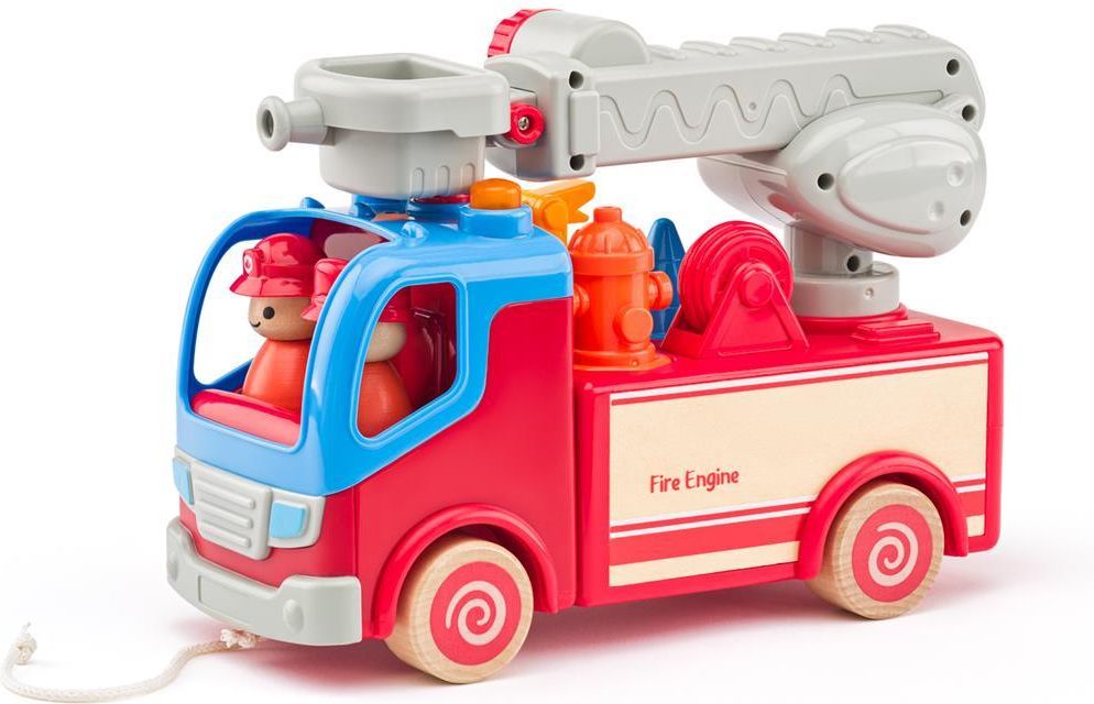 ND17_ZB-179257 Woz strazacki z dzwiekami i swiatlem 92052 Woody Wóz strażacki wykonany jest z połączenia wysokiej jakości plastiku i drewna. Zawiera liczne akcesoria ratownicze oraz 2 figurki strażaków. Posiada wysuwaną i obrotową drabinę z platformą, a naciśnięcie przycisku w kabinie kierowcy …
