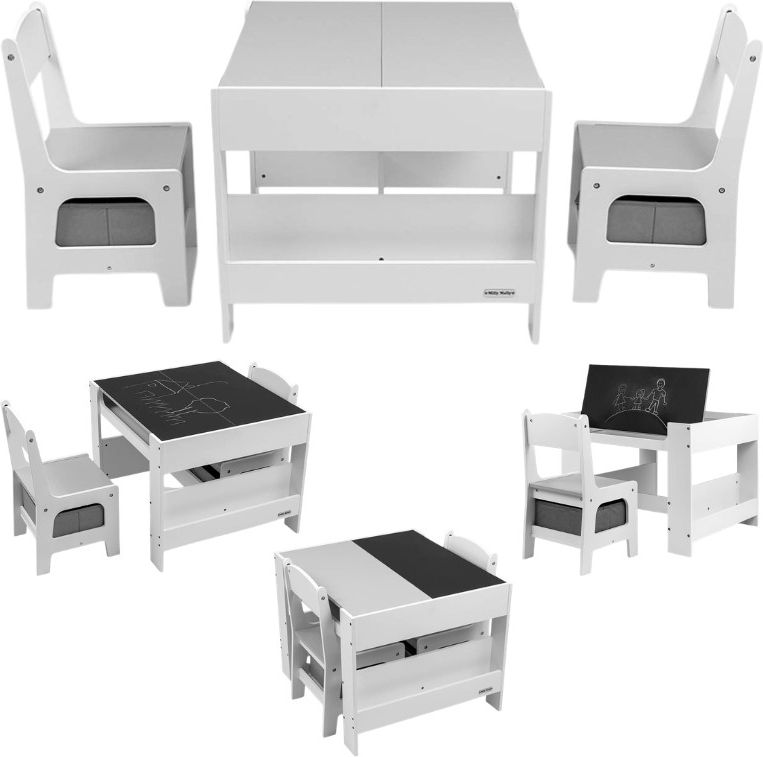 Milly Mally Sven Plus Zestaw Mebli Dla Dzieci Stolik + 2 Krzesła Mebelki Dziecięce Białe Informacje: Wykonanie: Wytrzymała i solidna płyta MDF. Dla kogo: Dzieci w wieku od 2 do 5 lat. Wymiar stołu: 61,5 cm x 57 cm x 48,5 cm (wys.). Wymiar krzeseł: 28,5 cm x 31 cm x 53 cm (siedzisko na wys. 27 cm). Udźwig: Bezpieczna konstrukcja wytrzyma do 35 kg obciążenia na każdym elemencie. Masa zestawu: 17,5 kg (zapewnia odpowiednią stabilność). Bezpieczeństwo: Pełna zgodność z rygorystyczną normą EN 17191:2021. Wyjątkowy kącik dla małego artysty: Meble dziecięce Sven pełne inspiracji Zadbaj o miejsce, w którym dziecięca wyobraźnia nie zna granic! Podaruj swojemu maluszkowi przestrzeń, która stanie się bazą dla jego pierwszych odkryć i artystycznych sukcesów. Wielofunkcyjne mebelki dla dzieci z serii Sven to coś więcej niż stół i krzesła – to przemyślane centrum dowodzenia, stworzone z myślą o wygodzie podczas malowania, układania klocków i twórczej nauki. Estetyka, która wspiera koncentrację i spokój Komplet w stonowanych, biało-szarych odcieniach to idealny wybór do nowoczesnego pokoju. Tak dobrane barwy wprowadzają do wnętrza kojący nastrój, co jest niezwykle ważne dla każdego przedszkolaka. Harmonijne otoczenie ułatwia skupienie uwagi na kolorowankach czy pierwszych literkach, wspierając Twoją pociechę w budowaniu samodzielności w miłej atmosferze. Magiczne skrytki na dziecięce akcesoria Dobrze wiemy, że porządek w dziecięcym pokoju to skarb, dlatego zestaw Sven kryje w sobie sprytne rozwiązania. Pod dwuczęściowym, ruchomym blatem znajdziesz pojemne schowki, które pomieszczą kredki, klocki i inne ważne drobiazgi. To nie wszystko! Pod krzesełkami umieściliśmy tekstylne pojemniki, w których ulubione pluszaki zawsze znajdą swoje bezpieczne miejsce po skończonej zabawie. Kreatywny blat z tablicą do rysowania Głównym atutem stolika jest jego dwustronna natura – wystarczy obrócić blat, aby zyskać czarną tablicę kredową, gotową na przyjęcie kolorowych rysunków. Blaty można również ustawić w pozycji pionowej, co daje jeszcze więcej opcji do kreatywnej aktywności. Dodatkowe półeczki po bokach stolika sprawiają, że książki i bloki rysunkowe są zawsze na wyciągnięcie ręki. Co znajdziesz w otrzymanej przesyłce? Wielofunkcyjny stolik z pomysłowymi schowkami i półkami. Dwa stabilne krzesełka z wygodnymi oparciami. Dwa materiałowe przyborniki na zabawki (pudełka pod krzesła). Pełen zestaw do montażu wraz z przejrzystą instrukcją krok po kroku. Dlaczego warto wybrać zestaw Sven? ✔️ Praktyczność 3w1 – jedno miejsce do pracy, przechowywania i rysowania kredą. ✔️ Pełne bezpieczeństwo – zaokrąglone rogi i solidne wykonanie chronią przed urazami. ✔️ Łatwe sprzątanie – gładkie powierzchnie wystarczy przetrzeć, by znów lśniły czystością. ✔️ Lekkość formy – krzesełka są na tyle lekkie, że maluch może je samodzielnie przestawiać. ✔️ Polska jakość – produkt zaprojektowany z dbałością o każdy detal i komfort dziecka.