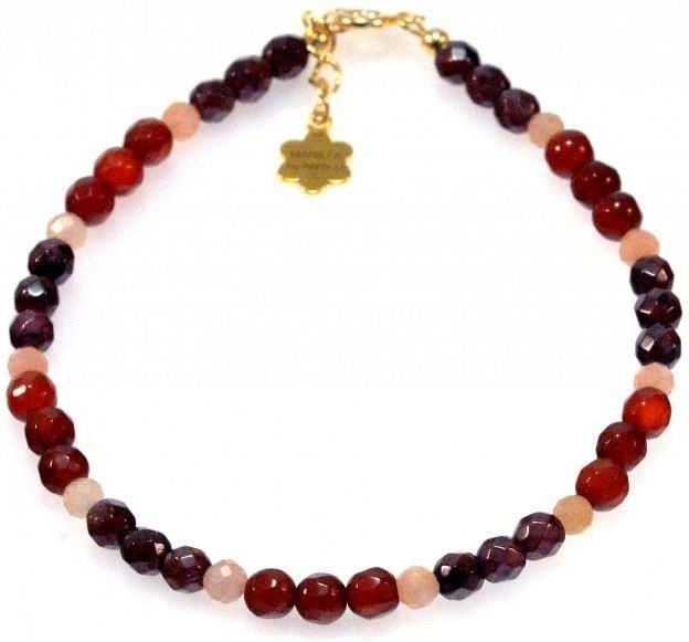 Bransoletka Czakra Sakralna 925 Bransoletka wykonana ze srebra próby 925, pozłacanego 24 karatowym złotem. Kamień: Granat, Karneol, Kamień Słoneczny Rozmiar kamienia: 3mm Długość: 17,5 cm + przedłużka do 19,5 cm Zapięcie: klasyczne (federing) Biżuteria ręcznie wykonana, produkt Polski. Żywioł …