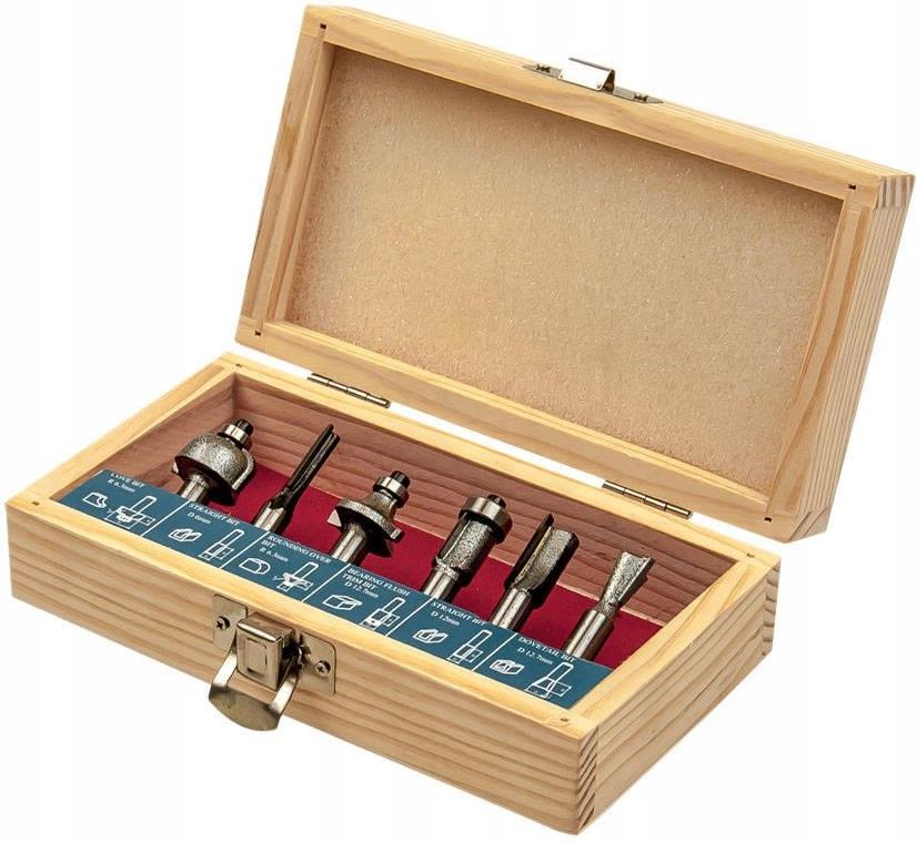 Zestaw zawiera: 2x Frez do wpustów: 6mm, 12mm 1x Frez do wyokrąglania: 12,7mm, R 6,3mm 1x Frez do zaokrągleń z łożyskiem kulowym: 21,8m, R 6,3mm 1x Frez do profili z łożyskiem kulowym: 25mm, R 6,3mm 1x Frez do wpustów: V 12,7mm 14'
