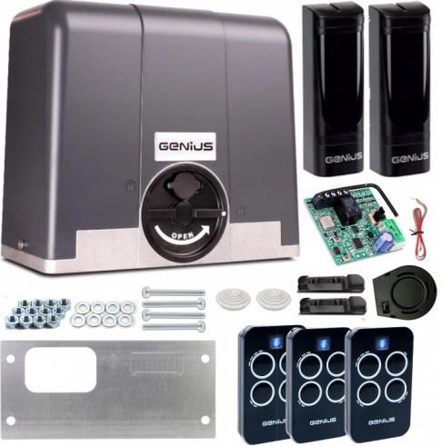 Oryginalny napęd FAAC-GENIUS BLIZZARD 500C. Napęd elektromechaniczny z silnikiem na 230V do bram przesuwnych do użytku przydomowego dla skrzydła o ciężarze do 500 kg. Napęd posiada wbudowany czujnik wykrycia przeszkody (encoder). Zawartość zestawu: Napęd FAAC-GENIUS BLIZZARD 500 C z centralą sterującą Czujnik wykrycia przeszkody (ENCODER) Krańcówki magnetyczne Odbiornik pilotów 433MHz lub 868MHz 2 x pilot XT4 4-kanałowy 868MHz Fotokomórki VEGA Instrukcja montażu w języku polskim Karta gwarancyjna FAAC Polska 24 miesiące Pilot Echo TX4 433 MHz - pracuje w częstotliwości 433,92 MHz - zasięg 40-200m - dynamiczne kodowanie za pomocą systemu ROLLING KOD ( ponad 70 bilionów kombinacji ) - zasilane baterią 12Vdc Samonastawne fotokomórki zewnętrzne w technologii tradycyjnej 24 Vac/Vdc, wyjątkowo kompaktowe, składające się z pilota i odbiornika na modulowane promienie podczerwieni. Kompaktowe wymiary umożliwiają łatwe pozycjonowanie na niewielkich przestrzeniach. Radioorbiornik Bravo 2-kanałowy, pamięć o pojemniści 250 pilotów Zabezpieczenie przeciwzgnieceniowe - ENKODER Magnetyczne wyłączniki krańcowe Elementy montażowe