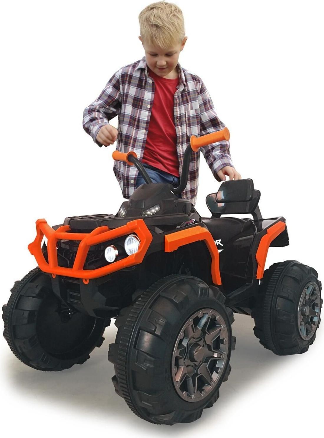 Samochód dla dzieci Jamara Ride On Quad Protector Dzięki temu quadowi Ride On firmy Jamara możesz wprowadzić do swojego domu prawdziwą maszynę do zabawy. Usiądź, naciśnij przycisk start, włącz radio FM i światło LED i wciśnij gaz. Dziecięce marzenia spełniają się dzięki Protector Quad od Jamara. Ten solidny pojazd dla dzieci jest wyposażony w masywne podwozie, wielofunkcyjną deskę rozdzielczą i wspaniałe efekty dźwiękowe. Dwa mocne silniki 12 V napędzają dwa tylne koła pojazdu. Elektronika steruje automatycznym mechanizmem różnicowym na 1. biegu w celu zwinnego pokonywania zakrętów i równomiernie rozdziela całą moc na oba koła na biegu turbo. Oznacza to, że quad poradzi sobie z niemal każdą przeszkodą. Około 90 minut jazdy gwarantuje prawdziwą zabawę. Jeśli zbiornik jest pusty, można łatwo zatankować w gniazdku. Najważniejsze cechy produktu:2 bieginapęd na 2 kołaPodświetlana deska rozdzielczaWskaźnik stanu akumulatoraRadio FMZłącze audio AUXZłącze USBGniazdo karty pamięci z funkcją MP3 (Micro SD)Muzyka2 mocne silniki napędoweElektroniczny mechanizm różnicowyWydajny akumulator 12 V zapewniający długi czas jazdyGniazdo ładowaniaReflektor LEDTylne światło LEDBardzo duże kołaPrzednie/tylne zawieszenie Dane techniczne:Zalecenia wiekowe: od 3 latWymiary: 99 x 65 x 67,50 cmWaga: 17,04 kgCzas jazdy: około 90 minutCzas ładowania: około 540 minutmaksymalne obciążenie: 30 kgBateria w zestawie: TakPojemność: 12V 7Ah Ostrzeżenia:Uwaga! Nie używać w miejscach publicznych i w ruchu drogowymUwaga! Istnieje ryzyko wypadku i obrażeńUwaga! Ta zabawka nie jest wyposażona w hamulecUwaga! Nieodpowiednie dla dzieci w wieku poniżej 36 miesięcy. Zawiera małe części, które mogą zostać połknięteUwaga! Używać pod bezpośrednim nadzorem dorosłychUwaga! Używać ze sprzętem ochronnym Typ produktu:Czterokołowiec do jeżdżeniaTyp napędu:Zasilanie bateryjneKolor produktu:Czarny, PomarańczowySugerowana płeć:Chłopak, dziewczynaZalecany wiek (min):3 lat(a)Liczba kół:4 szt.Prędkości:2Przednie światła:TakKlakson:TakBrzmienie:TakIlość silników:2Rodzaj baterii:12VPojemność baterii:7 AhSzerokość produktu:650 mmWysokość produktu:675 mmDługość produktu:990 mmWaga produktu:16,3 kg Jamara Ride-on Quad Protector pomarańczowy 12V 3+ Ride On - Protector Quad Nr art. 460449, pomarańczowy Wiek: 3+ Dzięki temu quadowi RideOn firmy Jamara możesz wprowadzić do swojego domu prawdziwą maszynę do zabawy. Usiądź, naciśnij przycisk start, włącz radio FM i światło LED i wciśnij gaz. Które dziecko o tym nie marzy? Teraz to marzenie może się spełnić - dzięki Protector Quad od Jamara. Solidne pojazdy do zabawy są wyposażone w masywne podwozie, wielofunkcyjną deskę rozdzielczą i świetne efekty dźwiękowe. Dwa mocne silniki 12 V napędzają dwa tylne koła pojazdu. Elektronika steruje automatycznym mechanizmem różnicowym na 1. biegu w celu zwinnego pokonywania zakrętów i równomiernie rozdziela całą moc na oba koła na biegu turbo. Oznacza to, że quad poradzi sobie z niemal każdą przeszkodą. Około godzina jazdy na jednym zbiorniku paliwa gwarantuje prawdziwą zabawę. Wystarczy zatankować do pełna i ruszyć w drogę. Najważniejsze cechy: - 2 biegi (wolny, szybki) - Przednie reflektory/tylne światła - Klakson i dźwięk - Podłączenie zewnętrznych źródeł dźwięku - 2 napędzane tylne koła - Elektroniczny mechanizm różnicowy - 2 mocne silniki 12 V i skrzynia biegów - Mocny akumulator 12 V zapewniający długi czas jazdy - Bezkluczykowy rozruch za pomocą przycisku start - Podświetlana deska rozdzielcza - Radio FM - Bardzo duże opony - Amortyzator Funkcje: - Do przodu/do tyłu - W lewo/w prawo - Stop Zakres dostawy: - Model - Akumulator napędowy - Ładowarka 230 V - Instrukcja Zalecane akcesoria: - Zapasowy akumulator, Art.-Nr art. 412078 - System sygnalizacji świetlnej Grand, nr art. 460256 - Zestaw znaków drogowych Grand A, nr art. 460257 - Zestaw znaków drogowych Grand B, nr art. 460293 - Kielnia policyjna, nr art. 460308 Dane techniczne: Wymiary ~ 990 x 650 x 675 mm Waga ~ 16300 g Akumulator 12 V 7 Ah Wskazówki bezpieczeństwa - UWAGA - Używać pod bezpośrednim nadzorem osób dorosłych. - UWAGA - Nieodpowiednie dla dzieci w wieku poniżej 36 miesięcy. Zawiera małe części, które mogą zostać połknięte. Niebezpieczeństwo zadławienia! Zawsze trzymać z dala od małych dzieci. - Nie używać na drogach publicznych ani w ruchu drogowym. - Ryzyko wypadku i obrażeń. - Ta zabawka nie ma hamulców. - Ze względu na maksymalną prędkość zabawka nie jest przeznaczona dla dzieci poniżej 3 roku życia.