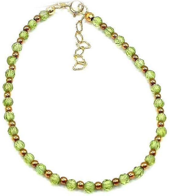 Bransoletka wykonana ze srebra próby 925,złoconego 24 karatowym, żółtym złotem Kamień: Oliwin+ Hematyt Rozmiar kamienia: 3/2 mm Długość: 17,5 cm Zapięcie: federing Bransoletka może być wykonana na gumce- prosimy o informację w uwagach do zamówienia Biżuteria ręcznie wykonana, produkt Polski