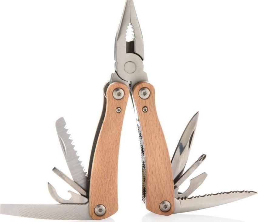 Trwałe i wytrzymałe narzędzie wielofunkcyjne wykonane z wysokiej jakości stali nierdzewnej, uchwyt z drewna bukowego, 13 funkcji: długie szczypce, kombinerki, przecinak do kabli i drutu, ostrze ząbkowane, otwieracz do butelek, duży śrubokręt płaski, śrubokręt krzyżakowy, nóż, piła, mały śrubokręt płaski, otwieracz do puszek, średni śrubokręt płaski, pilnik, w ozdobnym pudełku