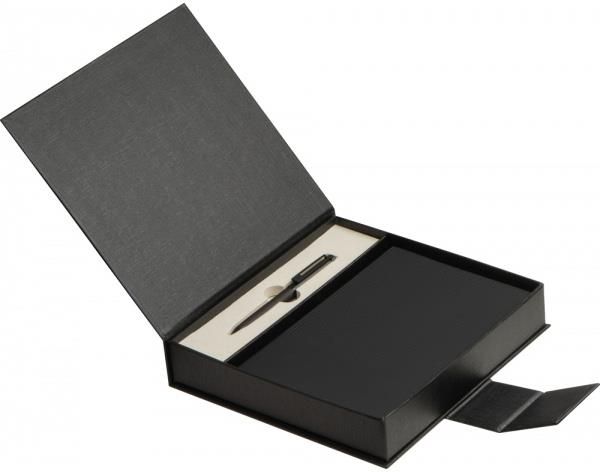 Zestaw składający się z piszącego na niebiesko, metalowego długopisu oraz z notesu w miękkiej okładce z 64 kartkami. Papier w notesie w linie wykonany z papieru pochodzącego z recyklingu. Całość zapakowana w ozdobne pudełko z magnetycznym zamknięciem.