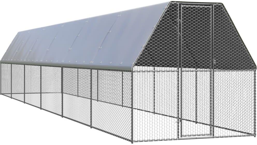 Ta praktyczna i przestronna klatka dla kurczaków to idealny wybór na zewnętrzne wybiegi dla kurczaków, kur, kaczek i innych małych zwierząt, zapewniając im komfort. Nadaje się również dla dużych ptaków i może służyć jako woliera. Ten kurnik jest wykonany z ocynkowanej stali. Posiada dach z polietylenu, który jest wodoodporny i odporny na promieniowanie UV. Bramka jest wyposażona w zamek, co zapewnia dodatkowe bezpieczeństwo małym zwierzętom. Warto wiedzieć: Aby zapobiec uszkodzeniom spowodowanym przez obfite opady śniegu, zalecamy regularne odśnieżanie dachu zimą. Kolor: srebrny i srebrnoszary Materiał: stal galwanizowana, PE (polietylen) Wymiary: 2 x 12 x 2 m (szer. x gł. x wys.) Z wodoodpornym dachem Zawiera drzwi z zamknięciem Wymagany montaż: tak