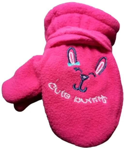 Grube, jednopalczaste rękawiczki dziecięce połączone sznurkiem. W całości wykonane z miękkiego polaru, który zapewnia ciepło i komfort noszenia. Zewnętrzną stronę rękawiczek zdobi urocza buźka królika.