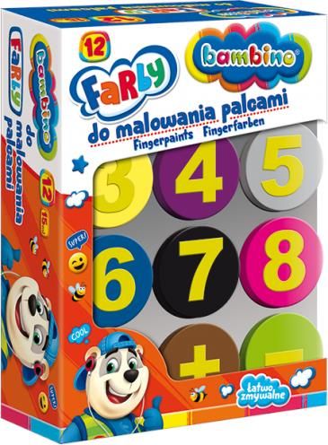 Farby do malowania palcami BAMBINO, 12 kolorów Cechy produktu: do malowania palcami łatwo zmywalne nieszkodliwe mogą być stosowane bez użycia wody idealnie rozprowadzają się na papierze, kartonie czy brystolu każdy pojemniczek posiada wieczko ze stempelkiem spełniają wymagania zasadnicze dyrektywy …
