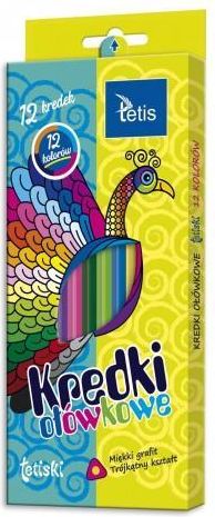 Kredki Tetiski Trójkątny kształt Kredki ołówkowe Miękki grafit Drewno lipowe Piękne, intensywne kolory Długość kredki: 178 mm, średnica kredki: 7,5 mm, średnica grafitu: 3 mm. Opakowanie 12 kolorów