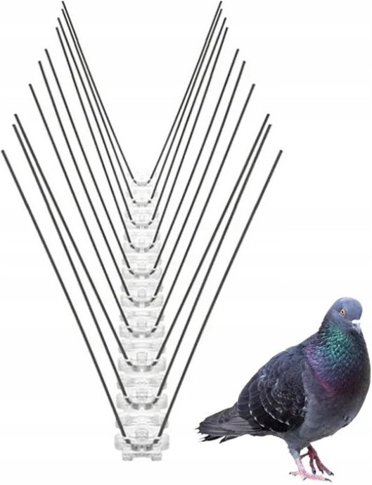 NIERDZEWNE ODSTRASZAJĄCE KOLCE NA PTAKI GOŁĘBIE Masz dość ptasich odchodów pod domem? Kolce skutecznie zapobiegają zagnieżdżaniu się gołębi. Trwałość zapewniają podstawy z przezroczystego, praktycznie niewidocznego poliwęglanu W prosty i szybki sposób możemy je montować za pomocą kleju, gwoździ, wkrętów, opasek kablowych itp. Możliwy jest montaż na płaskich, zakrzywionych lub nieregularnych powierzchniach. Są przyjazne dla środowiska, nie szkodzą ptakom, zmieniają ich przyzwyczajenia jednocześnie nie raniąc. Dane techniczne Długość pojedynczego modułu: 50 cm Liczba kolców na 50cm listwy: 40 szt. Wysokość kolców: 11,5 cm Rozstaw kolców: co 2,5 cm Instrukcja instalacji Dokładnie oczyść podłoże, używając szpachelki, szczotki drucianej lub szmatki. Nie jest to zadanie łatwe, dlatego zaleca się korzystanie z rękawic i okularów ochronnych. Jeśli masz do czynienia z powierzchniami metalowymi (nie malowanymi, nie powlekanymi), przetrzyj je środkiem odtłuszczającym, na przykład denaturatem. W przypadku powierzchni betonowych, jeśli jest to konieczne, zagruntuj je. Aby przymocować kolce do powierzchni drewnianych, użyj wkrętów. Moduły kolców posiadają otwory co 5 cm, więc można je przykręcić w odpowiednich miejscach. Na podstawie kolców nałóż warstwę kleju o grubości około 5 mm, używając pistoletu do silikonu. Na powierzchnie drewniane kolce należy montować za pomocą wkrętów lub gwoździ karbowanych. Pamiętaj, że moduły kolców posiadają bruzdy co 50 mm, więc w razie potrzeby można je łatwo połamać na mniejsze odcinki. Starannie układaj kolce na podłożu i dociskaj je ręką lub szpachelką. Montaż kolców powinien odbywać się na w pełni wyschniętej powierzchni. Minimalna temperatura montażu to +5°C, a czas schnięcia wynosi 24 godziny. WYSYŁANE KOLCE I PANEL Z POLIWĘGLANU NIE SĄ ZŁOŻONE W JEDNĄ CAŁOŚĆ.KOLCE NALEŻY SAMODZIELNIE ZAMONTOWAĆ NA PANELU.