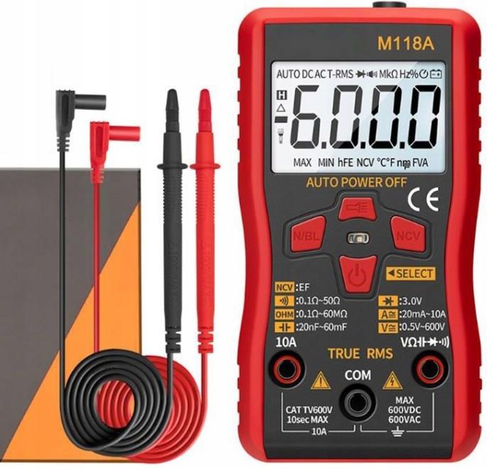 Uniwersalny miernik elektryczny multimetr cyfrowy ANENG M118A Uniwersalny multimetr pomiarowyAneng M118A niezbędny w każdym warsztacie elektrycznym, elektronicznym jak i w domu. Łatwy w obsłudze. Zwarta budowa wyposażona w uchylną podstawkę ułatwiającą obserwację pomiarów oraz ochronną elastyczną obudowę chroniącą przed uszkodzeniami mechanicznymi. Duży wyświetlacz, dodatkowo podświetlany (podświetlenie uruchamiane przyciskiem) pozwala na komfortową pracę w każdych warunkach oświetleniowych. Oprócz podstawowych funkcji pomiarowych oferowanych przez multimetry cyfrowe takich jak: pomiar napięcia, prądu, rezystancji, zatrzymania wskazań ma również funkcje pomiaru wzmocnienia (hFE) tranzystorów bipolarnych typu NPN i PNP, diod półprzewodnikowych oraz dźwiękową sygnalizację rezystancji mniejszej niż 30 omów (test zwarcia, ciągłość połączenia). Poniżej pełen wykaz funkcji. W skład zestawu wchodzą multimetr Aneng M118A - 1 sztuka przewody pomiarowe standardowe 75cm - 1 para polska instrukcja obsługi - 1 sztuka zestaw nie zawiera bateri Dane techniczne Waga: 100.5g, Wymiary: 115x60x25mm, Temperatura pracy: 0°C ~ 40°C, Polaryzacja: automatyczna, Próbkowanie: 2x sek. Wyświetlacz: LCD 1,12 cala. Zastosowanie Ze względu na szeroki zakres zastosowania multimetr Aneng M118A znajduje zastosowanie w: diagnostyce samochodowej: akumulator, alternator, bezpieczniki, przełącznik, przekaźniki, układ zapłonu, pobór prądu akumulatora przy wyłączonym silniku, elektronice domowej: przewody, gniazda, sprzęt elektroniczny, serwisie: elektryczny i elektroniczny, edukacji: szkolnictwo i dydaktyka. Zakresy pomiarowe Miernik Aneng M118A charakteryzuje się następującymi zakresami pomiarowymi: napięcie stałe: DC 6V/ 60V/ 600V ±(0.5% + 3), napięcie przemienne: AC 6V/ 60V/ 600V ±(0.5% + 3), prąd stały i zmienny: 6A/10A ±(2% + 30), rezystancja: 600Ohm ±(0.8% + 5), 6kOhm/60kOhm/600kOhm/6MOhm ±(0.8% + 3) 60MOhm ± (2.5% + 3), pojemność: 20nF - 60mF sygnalizacja dźwiękowa: < 50Ohm, wykrywanie przewodów pod tynkiem: napięcie zmienne, tryb latarki, pomiar wartości skutecznej True RMS, pomiar względny napięcia, prądu i pojemności REL, zatrzymanie pomiarów (HOLD), automatyczny wyłącznik w przypadku bezczynności, wskaźnik niskiego napicia, pomiar wzmocnienia tranzystorów, pomiar temperatury.